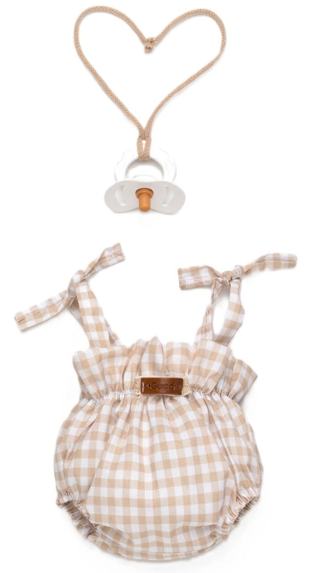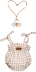 Bēšīgi baltā rūtainā kombinezona tipa romperis ar sasienamām lencēm, elastīgām bikšu starām un rievotu jostu droši pieguļ lellei un izskatās lieliski fotogrāfijās.