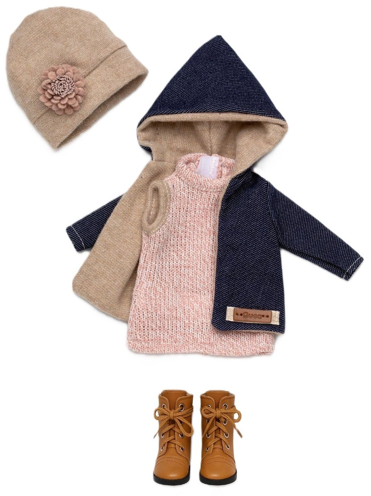 Mētelītis ar kapuci un adītās detaļas silda lellīti, kamēr kurpītes piešķir komplektam reālistisku noskaņu.