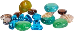 Blokā atradīsiet gludus, spīdīgus akmentiņus zilās, zaļās un dzintara nokrāsās, kā arī sīkus gliemežvākus. Katrs gabals ir unikāls.