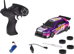 - RC auto, tālvadības pults, 4 rezerves riteņi, 3,7 V akumulators, USB uzlādes kabelis, skrūvgriezis