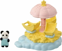 Komplektā ietilpst mīlīga mazās pandas figūriņa ar kustīgām ķermeņa daļām, ko var viegli nosēdināt sēdekļos vai novietot dažādās pozās. Karuseļa kompaktie izmēri (aptuveni 15 × 14 × 12 cm) lieliski iederas jebkurā bērnistabā un sader ar citiem Sylvanian Families komplektiem.