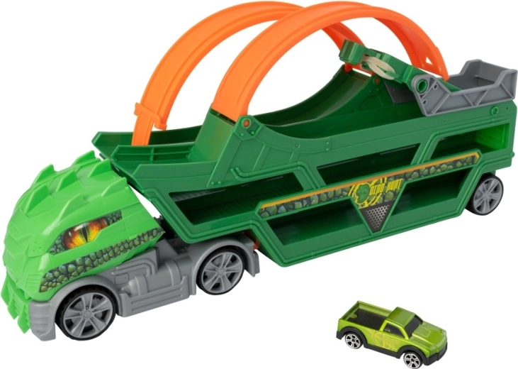 Pateicoties pārdomātajai konstrukcijai, komplekts ietilpina līdz 14 autiņiem, tāpēc bērniem viņu autoparks vienmēr ir līdzi. Kvalitatīvs plastmasas izpildījums, pievilcīgs dizains ar dinozauriem un uzrakstu “Dino Hunt”, kā arī iekļautais metāla modelis zaļi–melnā krāsu salikumā padara to par lielisku rotaļlietu gan mājās, gan ceļā.