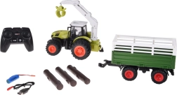 Šis detalizēti izstrādātais RC traktors ikoniskā zaļā krāsā iepriecina ar lielām riepām ar dziļu protektoru labākai saķerei un robustu piekabi kravas pārvadāšanai. Manuāli vadāmais roks pagriežas par 360°, to var pacelt un nolaist, bet satvērējs manuāli atveras un aizveras – ideāli pievienoto baļķu iekraušanai.