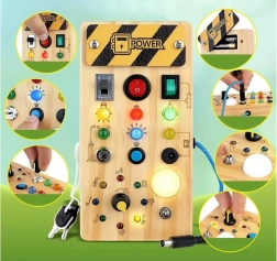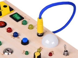 Šis koka Montessori aktīvais dēlis apvieno praktisku mācīšanos un sensoru spēli. Bērni pievieno kabeli, spiež pogas, pārslēdz slēdžus un vēro, kā krāsainās LED reaģē – tā dabiski apgūst cēloņa–seku likumsakarības un trenē smalko motoriku un acu–roku koordināciju.