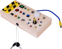 Atklājiet kompaktu Montessori dēli, kas attīsta smalko motoriku, koncentrēšanos un loģisko domāšanu. Bērniem patiks spīdošās LED diodes, slēdži un pogas, atslēdziņa un grozāms regulators. Droša dabiska koksne, gludas malas un klusa, jēgpilna izklaide bez ekrāniem – ideāli mājās un ceļā.
