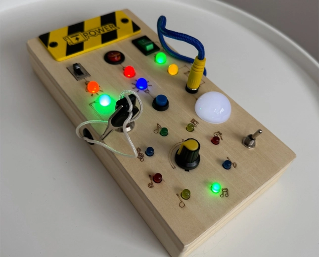 Dēlis ir izgatavots no dabiskas koksnes un saplākšņa, visas malas ir gludi noslīpētas. LED ir saudzīgas acīm, un elementi pielāgoti bērnu rokām.