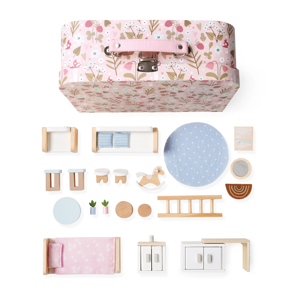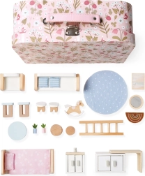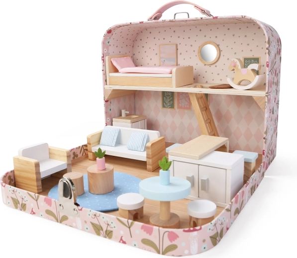 Atklājiet burvīgu pasauli ceļā: pārnēsājams leļļu namiņš, kas paslēpts elegantā koferītī. Atverot tas pārvēršas mājīgā miteklī ar miniatūru mēbelēm un dekorācijām. Ideāli spēlēm mājās un ceļojumos, veicina bērnu radošumu un iztēli. Ietver šūpuļzirdziņu, gultiņu, dīvānu, krēslu, kāpnes uz augšstāvu un citus piederumus. Pārnēsājams koferītis, bagātīgs aprīkojums, viegli pārnēsājams un izklaide bērniem no 3 gadu vecuma.