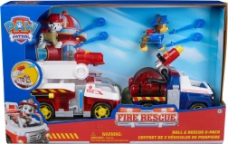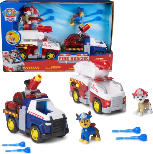 Dodies glābšanas misijā kopā ar Čeisu un Māršalu! Katra figūriņa ir aptuveni 6–7 cm augsta, ar kustīgu galvu un sēž savā transportlīdzeklī, gatava darbībai. Čeisa zilais glābšanas auto un Māršala sarkani-baltais ugunsdzēsēju auto ir aprīkoti ar “ūdens” šāviņiem un jumta/sliežu lielgabaliem realistiskai spēlei.