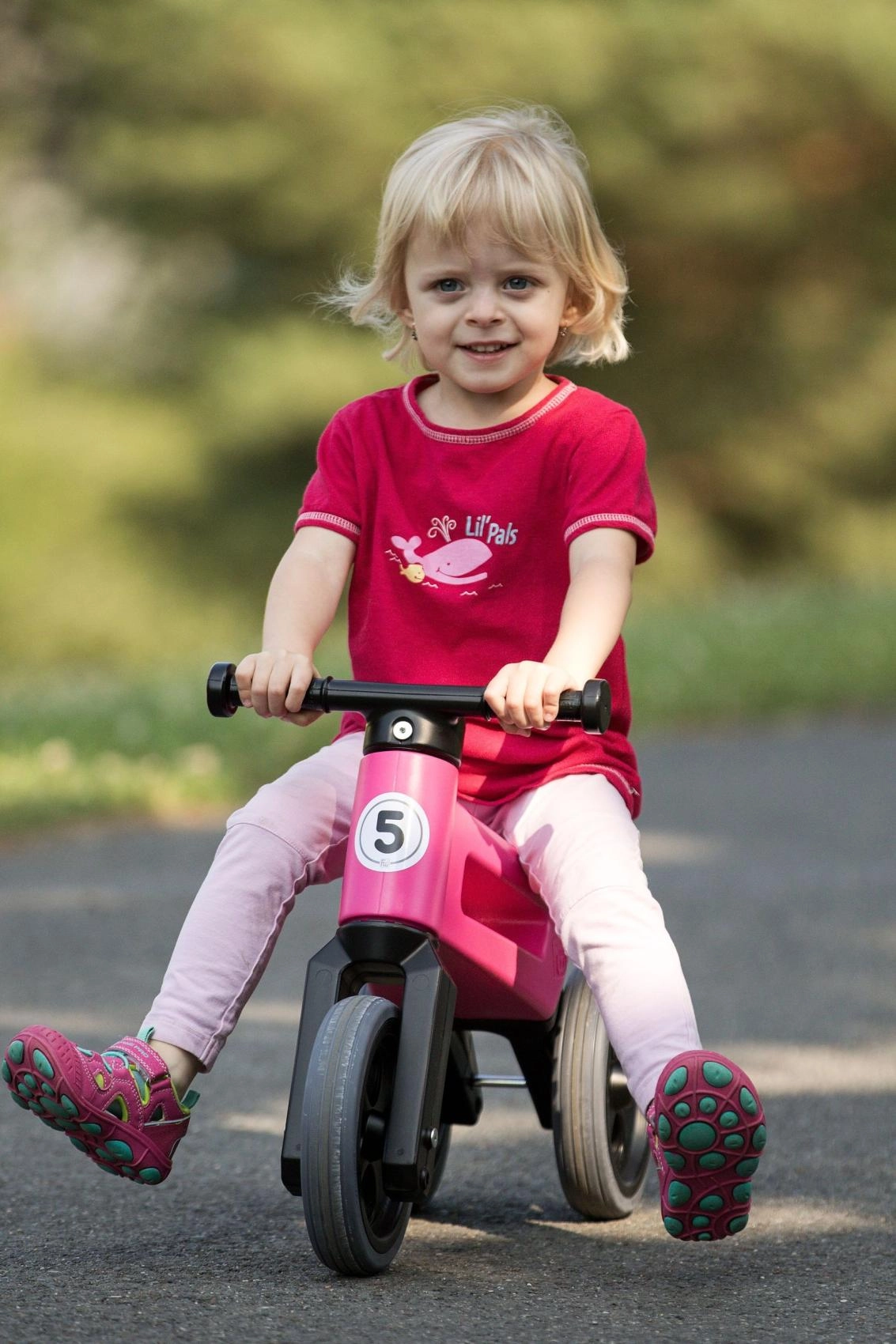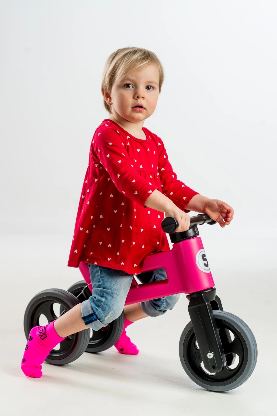 Sāciet ar stabilu trīsriteni un, kad pienāk laiks trenēt līdzsvaru, vienkārši nomainiet divus aizmugurējos riteņus pret vienu. Ideāli plūdenai pārejai uz pirmo velosipēdu.