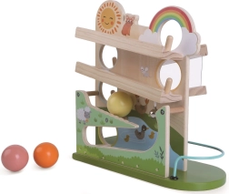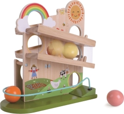 Šī radošā lodīšu trase ar svaigu lauku dizainu pārvērš katru spēli krāsainā piedzīvojumā. Bērni vēro, kā lodītes ripo pa dažādi slīpām trasēm, pazūd atverēs un atkal parādās – to visu pavada jautras saules, varavīksnes un dzīvnieku ilustrācijas. Stabilā pamatne un rūpīgi apstrādātās koka detaļas nodrošina drošu lietošanu arī pašiem mazākajiem.