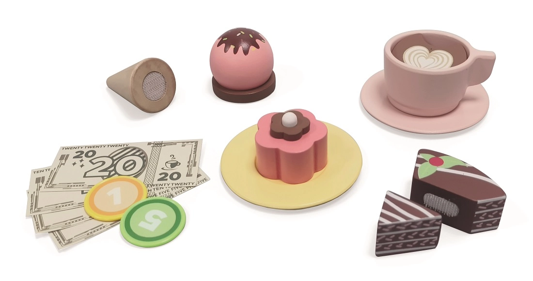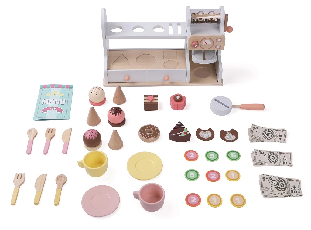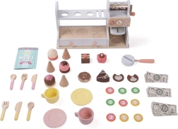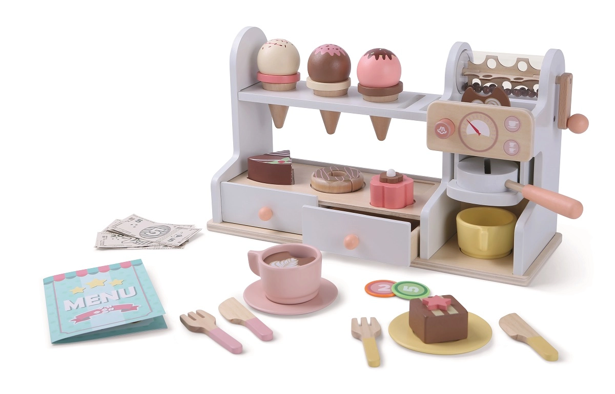 Šī stilīgā koka konditoreja un kafejnīca 2 vienā pārvērtīs bērnistabu par mazu bistro. Kompakts lete ar kafijas automātu, desertu vitrīnu un plauktiņu ar atverēm saldējuma bumbiņām aicina uz bezgalīgu izklaidi. Komplektā ir arī maksājumu atvilktne ar neīstiem naudas līdzekļiem, lai bērni varētu trenēt gan apkalpošanu, gan norēķinus.