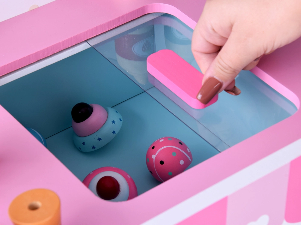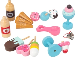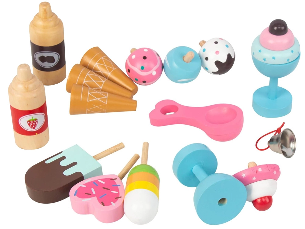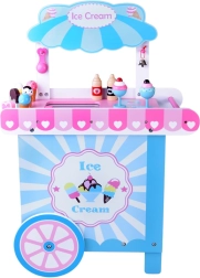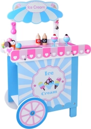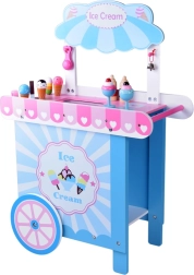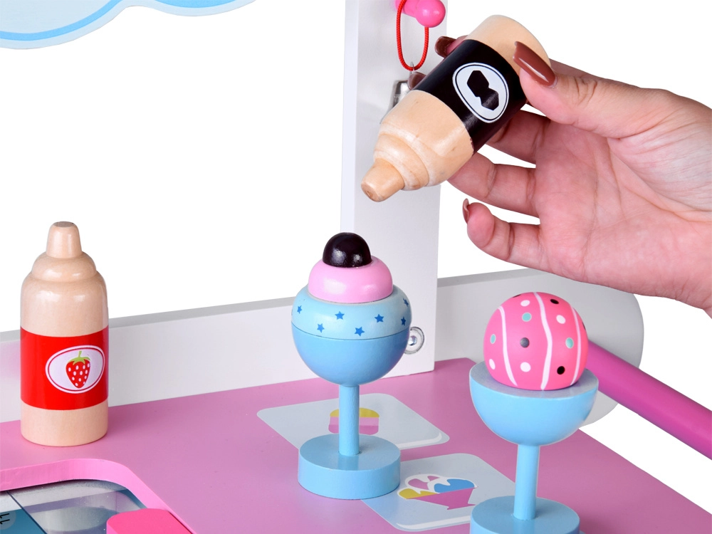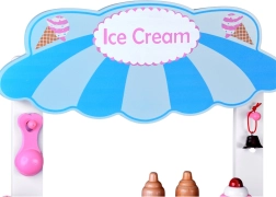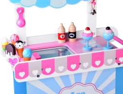 Pievilcīgs koka saldējuma stends pasteļtoņos iepriecinās ikvienu mazo pārdevēju. Pateicoties lieliem pārvietojamiem riteņiem, plašai tirdzniecības virsmai un bagātīgai piederumu kopai, tas piedāvā stundām ilgu radošu spēli. Drošas netoksiskas krāsas un izturīga konstrukcija nodrošina ilgmūžību un ērtu spēlēšanos gan mājās, gan dārzā.