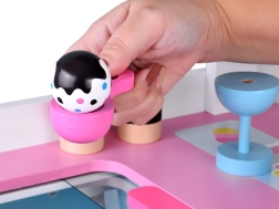 Šis stilīgais bērnu saldējuma ratiņš maigos rozā un zilajos toņos ir ideāli piemērots veikala un kafejnīcas spēlēm. Augšējā virsma kalpo kā tirdzniecības lete saldējuma bumbiņām, konusiņiem un eskimo kārumiem, zem tās atradīsiet lielu plauktu un bīdāmu “ledusskapi” našķu un piederumu glabāšanai. Praktiski divi āķi un sudrabots zvaniņš piešķir autentisku pasniegšanas pieredzi.