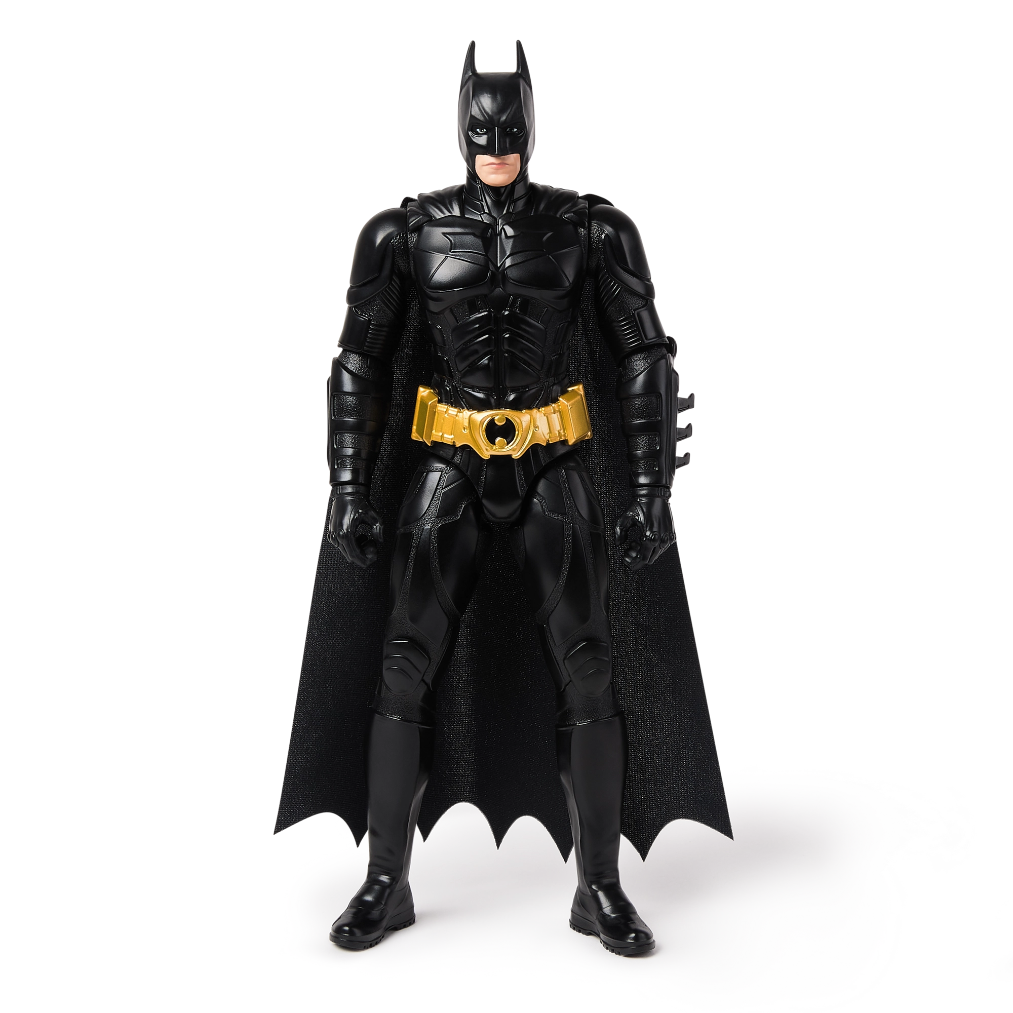 Melnais tērps ar zeltīto jostu, veidotais bruņojums un garais apmetnis uzticami ataino BATMAN filmu dizainu no The Dark Knight.