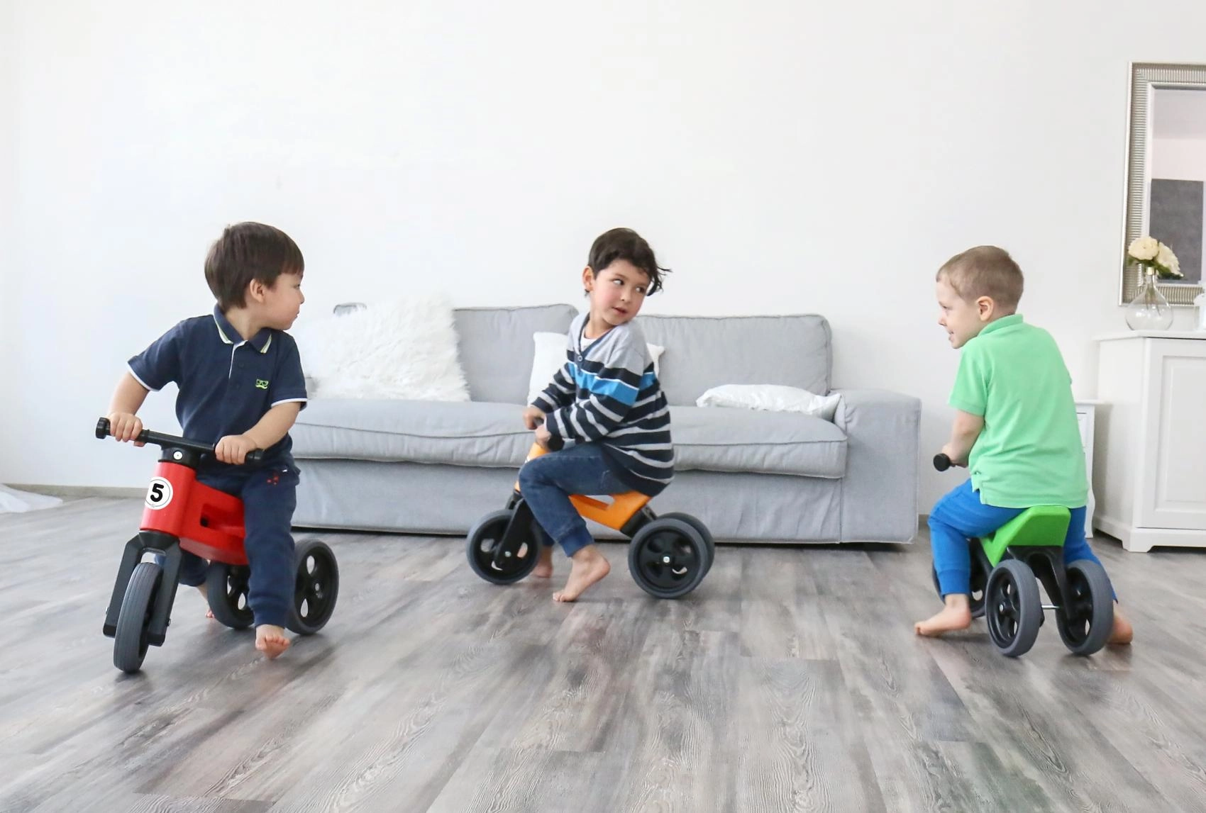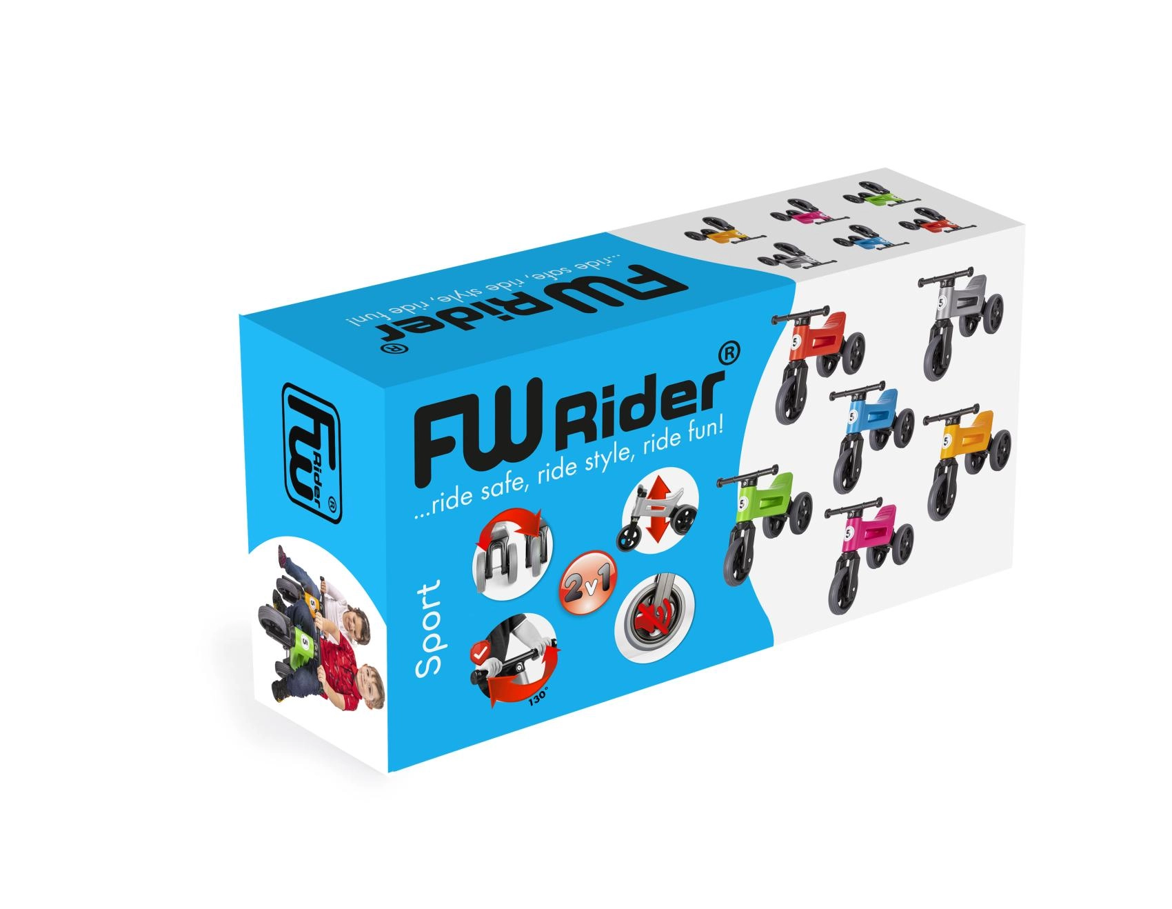 FUNNY WHEELS Rider Sport 2‑in‑1 sniedz bērniem kustību prieku un vecākiem gudru risinājumu uz ilgu laiku. Dažu minūšu laikā to var viegli pārveidot no trīsriteņa par divriteni un iestatīt divas sēdekļa augstuma pozīcijas atbilstoši bērna augumam. Klusās riepas nečīkst un neslīd, tāpēc tās ir ideāli piemērotas gan gludām virsmām, gan āra ietvēm.