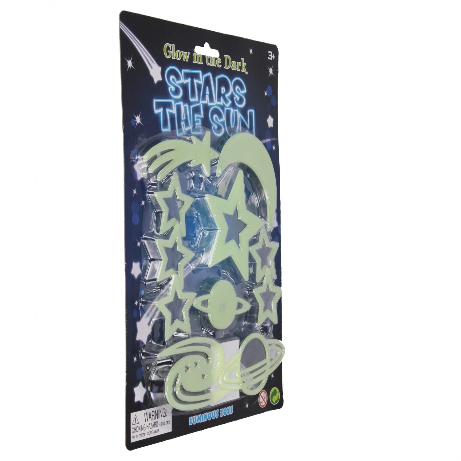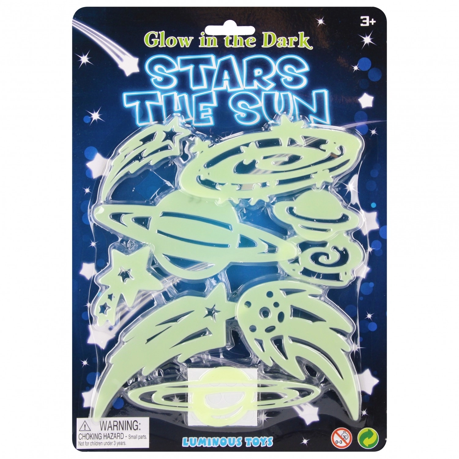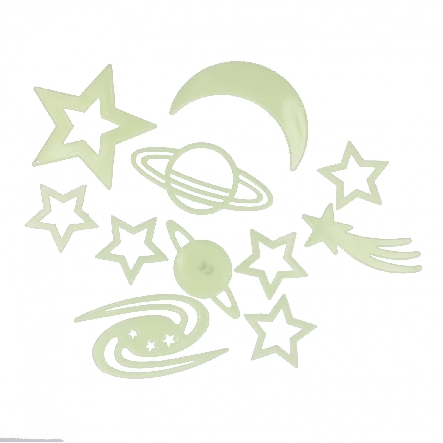 Pārvērtiet bērna istabu par mazu kosmosu! Šīs fluorescējošās kosmosa dekorācijas skaisti spīd tumsā, tās ir viegli pielīmēt pie sienas un griestiem un tās reaģē arī uz UV gaismu. Motīvu mikss – planētas, zvaigznes un citas formas. Piemērotas bērniem no 3 gadu vecuma. Cena par gabalu.