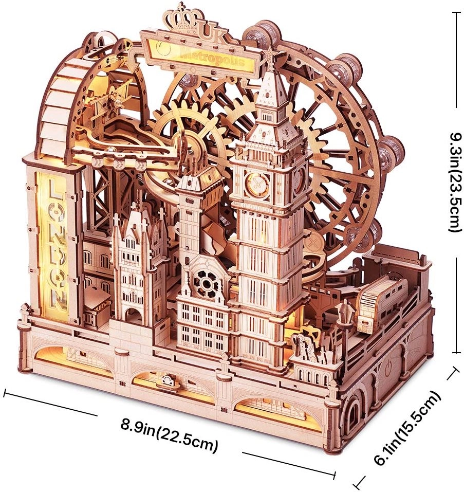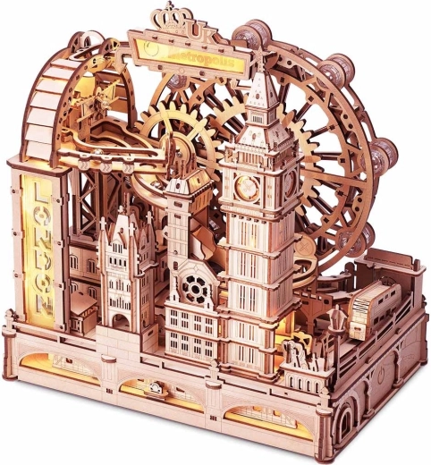 Atklājiet ikoniskus Londonas objektus elegantas 3D koka puzles veidā. Modelis apvieno Bigbenu, Tauerbridžu un Londonas aci ar dinamisku lodīšu trasi, kur metāla lodītes slīd pa rampām un tuneļiem gravitācijas un jaudīga motora vadītas. Neiztrūkst arī simboliskie Kroņjuvelieri – viss ar uzsvaru uz precīzu izpildījumu.