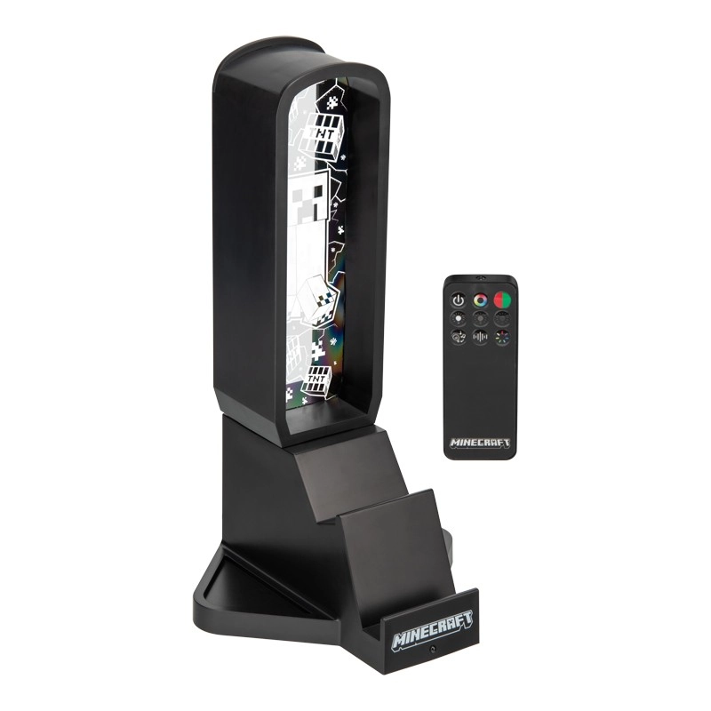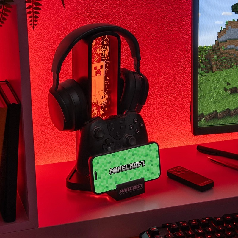 Pievieno savam spēļu stūrim noskaņu ar Minecraft stilā veidotu austiņu turētāju. 30 cm augstums nodrošina stabilu vietu lielākajai daļai austiņu, bet integrētais tālruņa statīvs noturēs tālruni vienmēr pa rokai. Vairāki apgaismojuma režīmi rada unikālus gaismas efektus gan spēlēšanai, gan darbam.