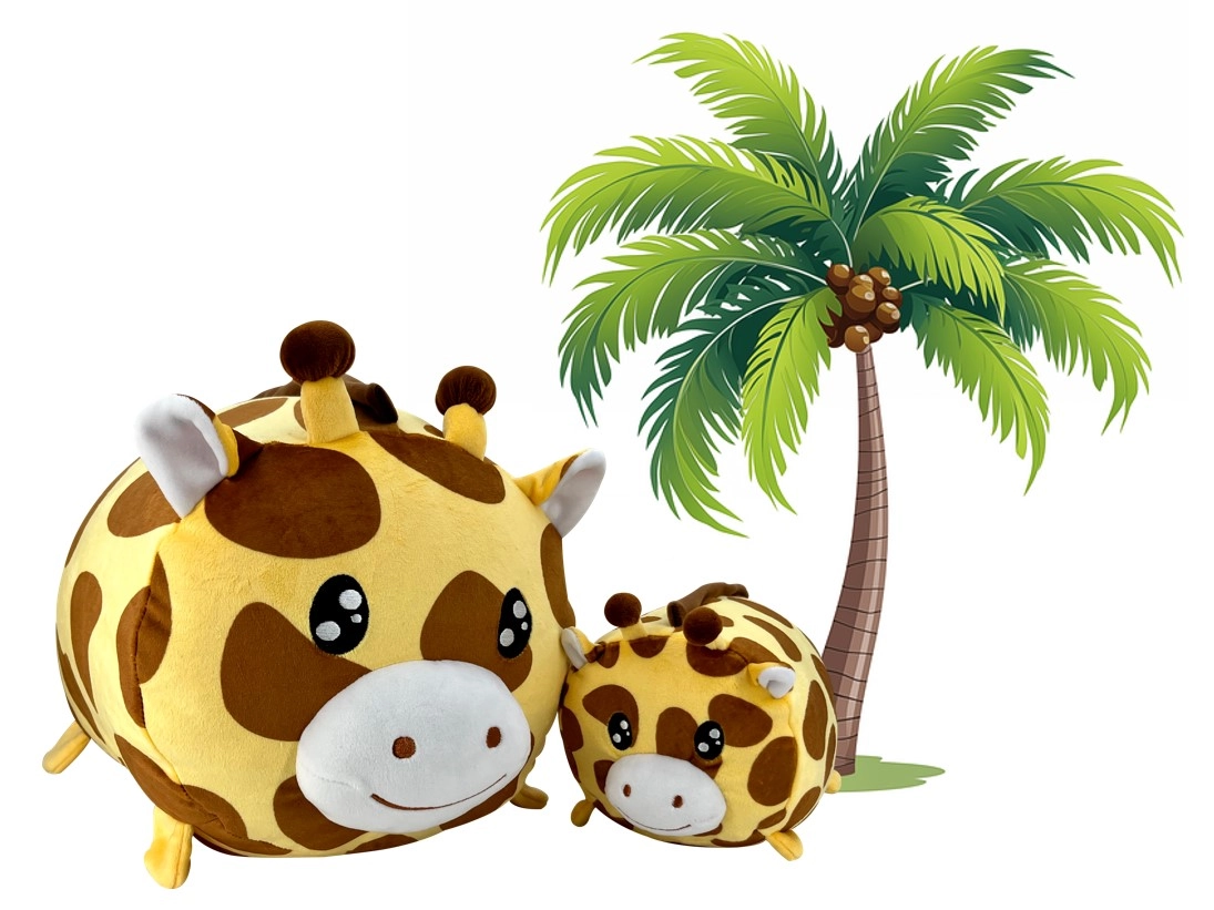 Divu izšūtu plīša žirafu komplekts ienesīs maigas bučas un mīļu dekoru bērnistabā. Apaļā forma, smalks plīšs un drošas šūtās detaļas nodrošina ērtu mīļošanos pat pašiem mazākajiem zīdaiņiem, savukārt lielāki bērni novērtēs lielāko žirafi kā spilventiņu automašīnā vai ceļā.