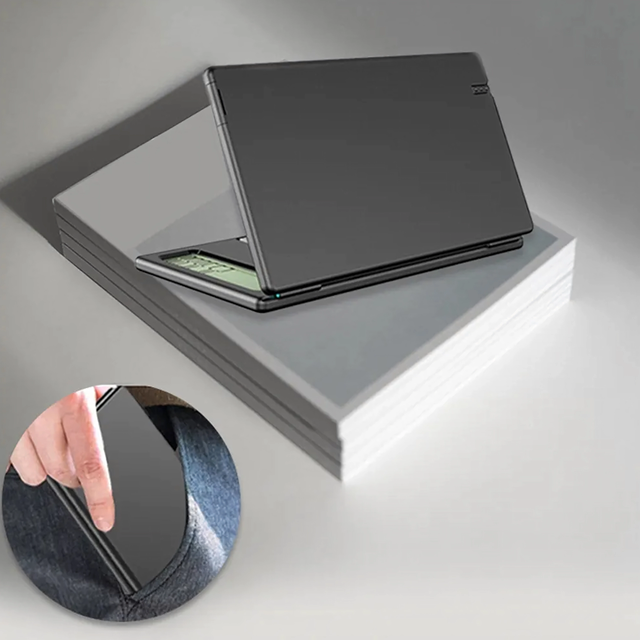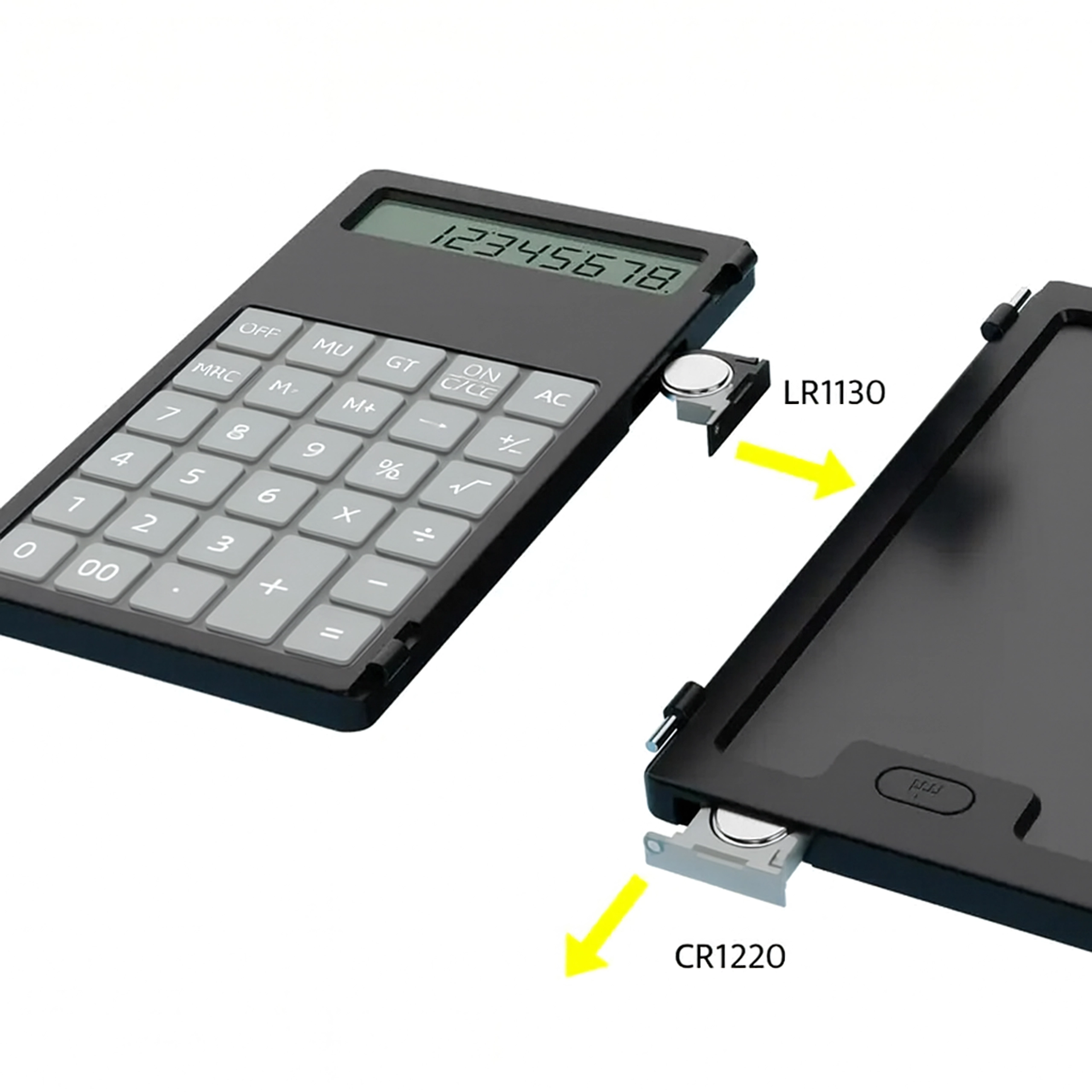 Kreisajā pusē precīzs kalkulators, labajā – LCD virsma ātriem pierakstiem; ideāli piemērots aprēķiniem, formulām un skicēm bez papīra.