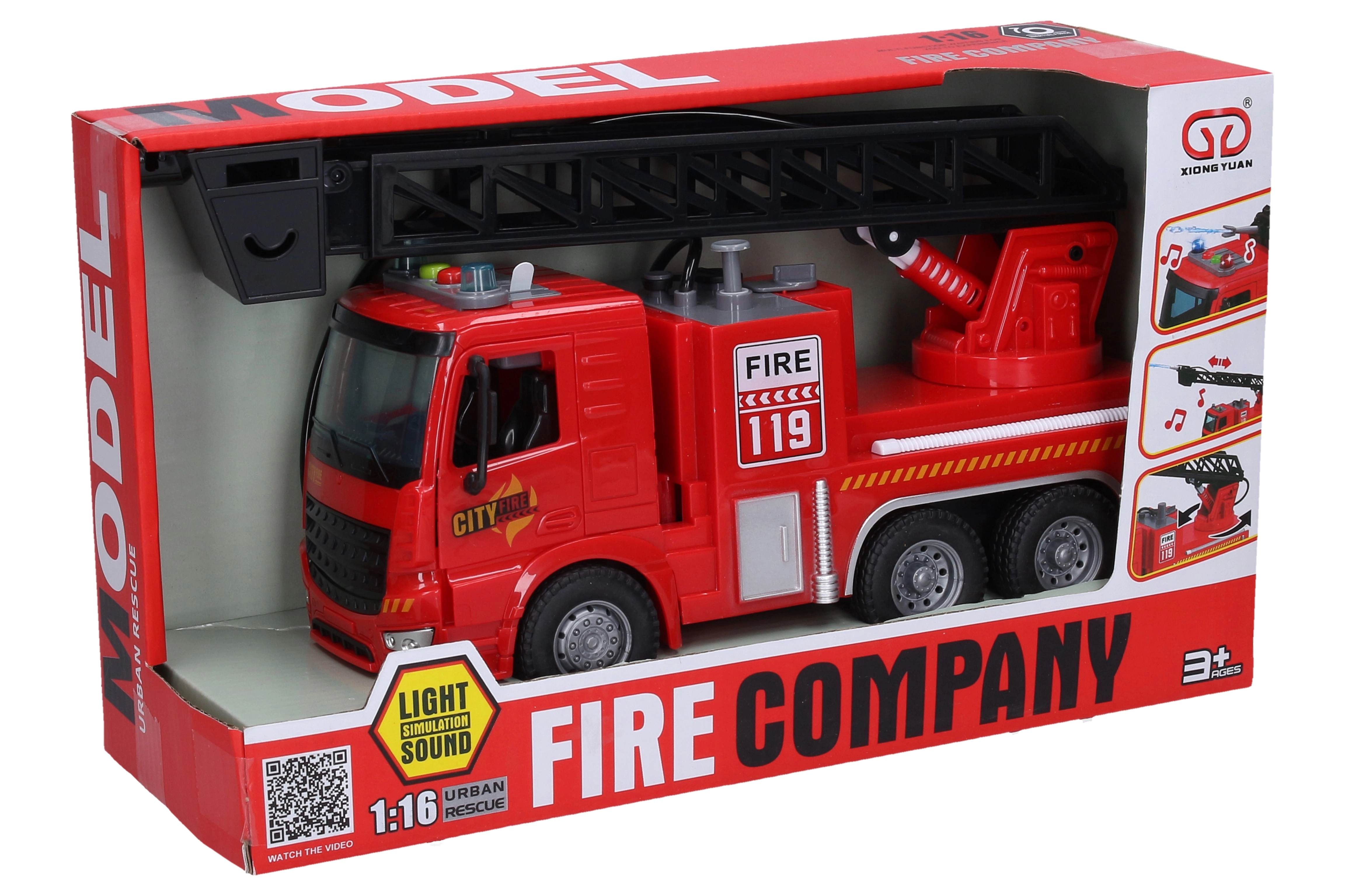 Reālistisks 30 cm garš ugunsdzēsēju auto bērniem piedāvā daudz darbības: smidzina ūdeni no iebūvētās tvertnes, brauc ar inerces piedziņu un piedāvā gaismas un skaņas efektus, ko aktivizē kabīnē esošās pogas. Baterijas ir iekļautas komplektā, tāpēc izklaide var sākties uzreiz.
