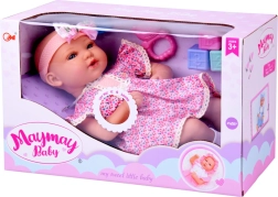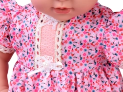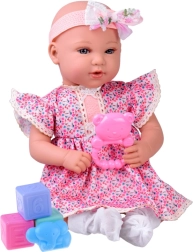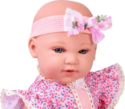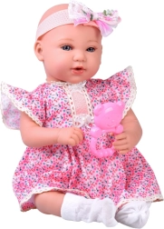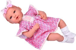 Mīlīga interaktīva bēbīšu lelle 46 cm izmērā apbur ar savu realistisko sejiņu, garām skropstām un mīkstu vēderiņu. Tai ir locītas rociņas un kājiņas ērtai pozēšanai, tā ir tērpta maigā lillā kleitiņā ar mežģīnēm, un ir iekļauts arī skaņas modulis vēl autentiskākai rotaļai. Iepakojumā atradīsiet arī pasteļkrāsas aksesuārus daudzveidīgai aprūpes spēlei.