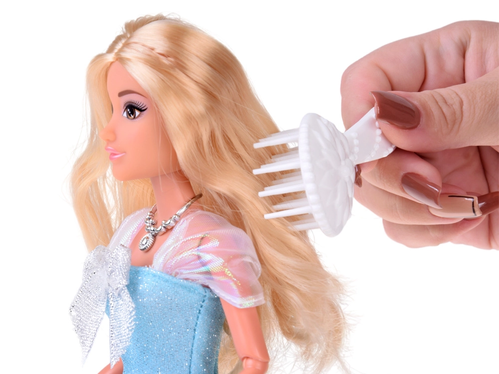 Garos blondo matu var ķemmēt ar komplektā iekļauto birsti – pīniet bizītes un veidojiet karaliskas frizūras.