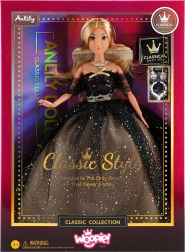 Atklājiet modes un elegances pasauli ar lelli Lily no Woopie. Viņas mirdzošā melni‑zelta kleita ir rotāta ar neskaitāmiem fliteriem, kas skaisti mirdz. Gari zeltaini blondi mati burtiski aicina ķemmēt, pīt un veidot oriģinālus matu sakārtojumus.