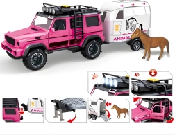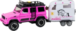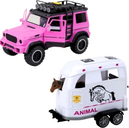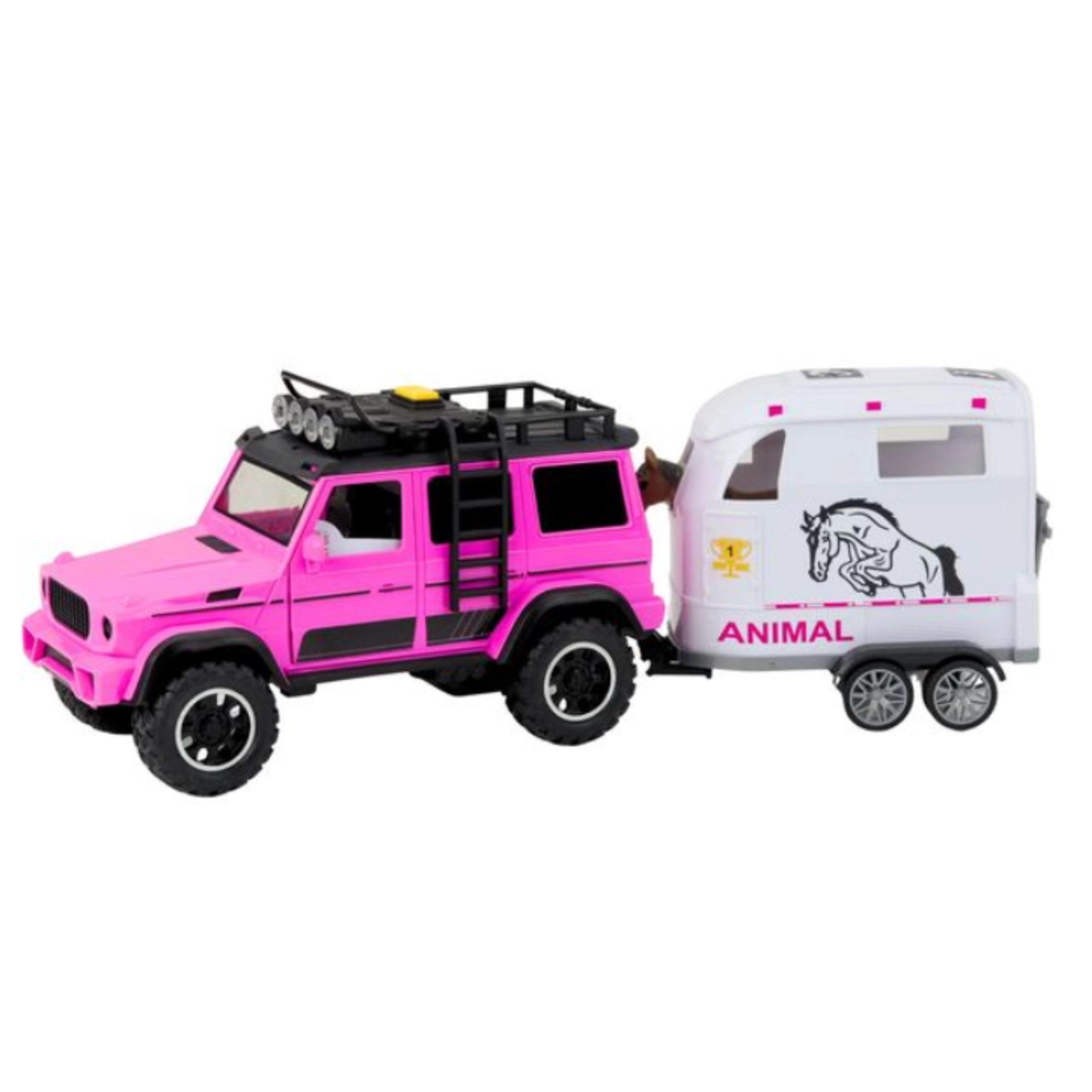 Šis detalizēti veidotais komplekts ir ideāls mazajiem dzīvnieku un apvidus auto cienītājiem. Rozā–baltais krāsu salikums piesaista uzmanību no pirmā acu uzmetiena, bet interaktīvie elementi, piemēram, gaismas, skaņas un atveramas durvis, nodrošina autentisku spēles pieredzi. Pateicoties noņemamajai piekabei, bērni var spēlēties ar auto, piekabi un zirdziņu arī atsevišķi, attīstot fantāziju.