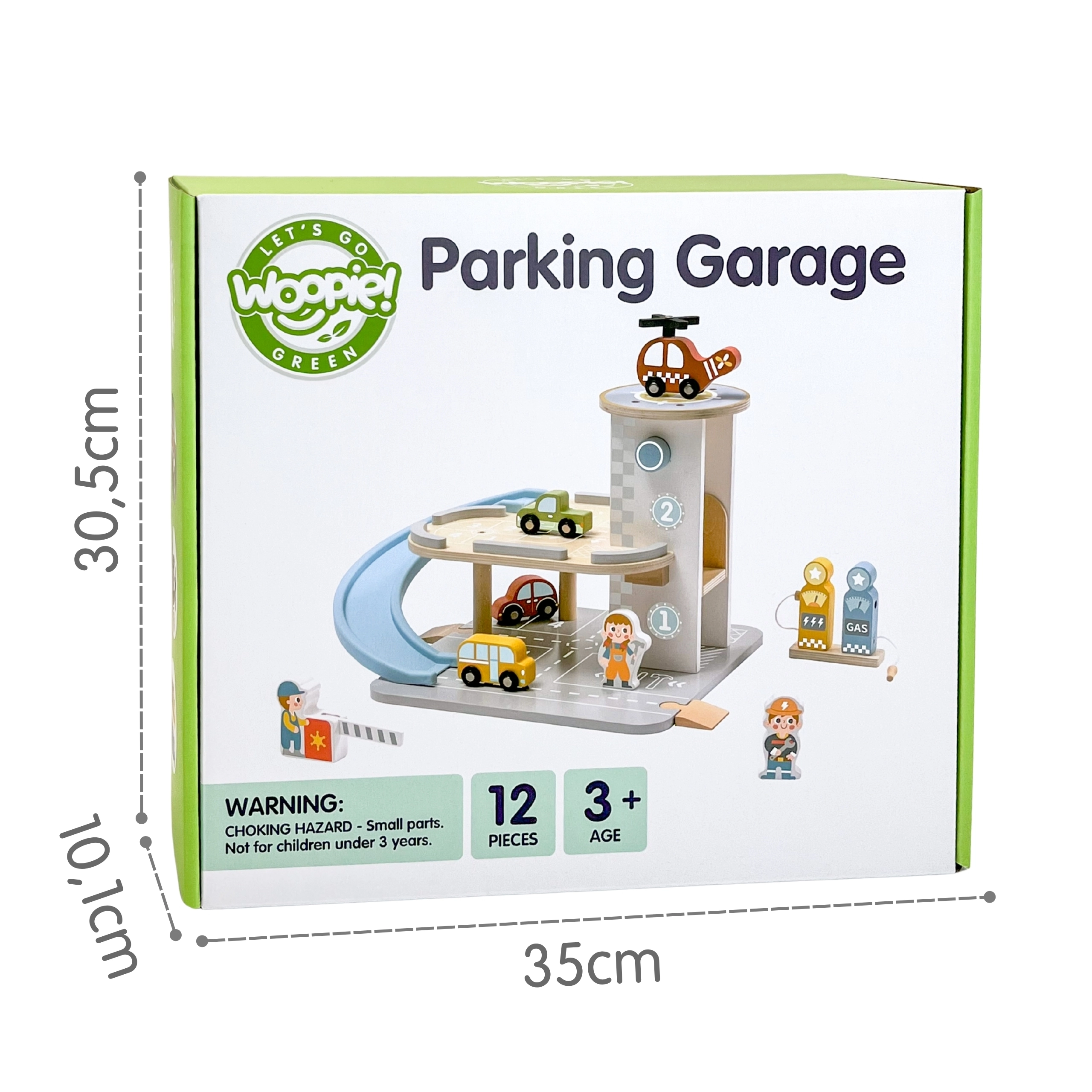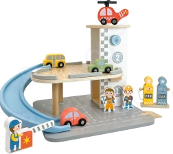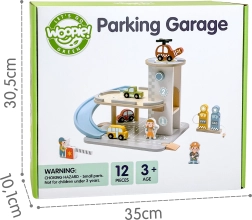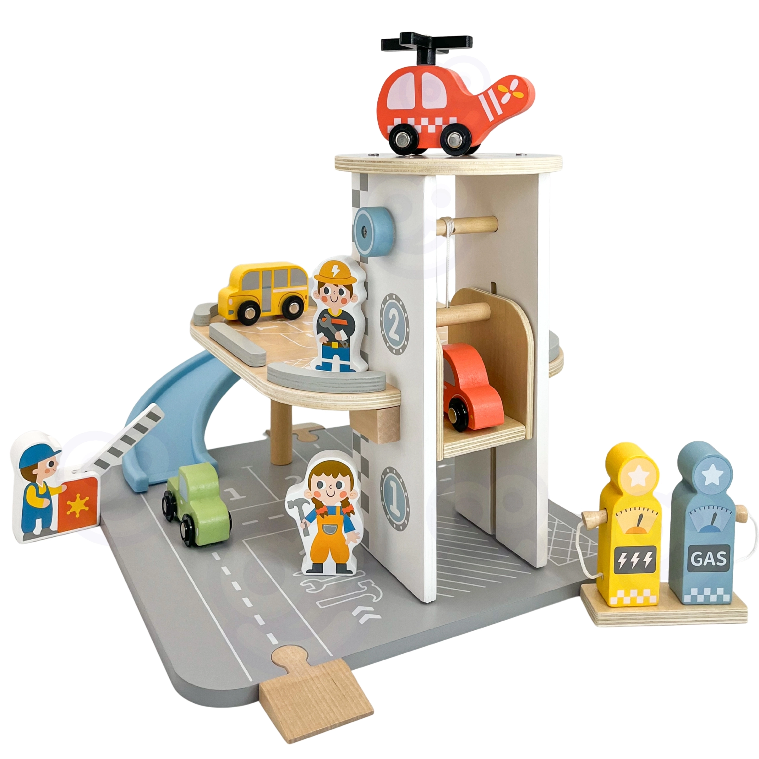 Koka autostāvvieta 2-in-1 apvieno divu līmeņu garāžu un degvielas uzpildes staciju, lai bērni varētu rotaļāties ar braukšanu, parkēšanu un uzpildīšanu. Mašīnītes slīd pa zilo spirālveida rampu, helikopters ar rotējošu propelleri nolaižas uz jumta heliporta, bet apkalpes figūriņas rūpējas par visu darbību. Kvalitatīvs koka izpildījums un stabila pamatne nodrošina drošu spēli no 3 gadu vecuma.