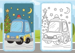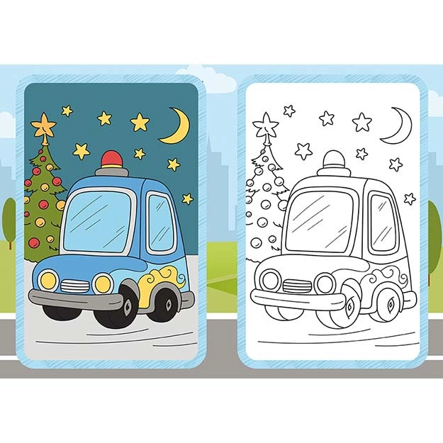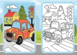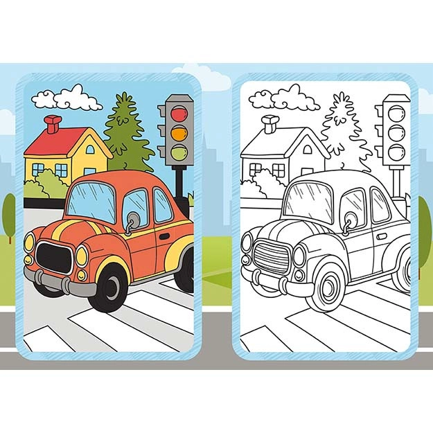Izklaidējoša krāsojamā grāmata ar transportlīdzekļu motīviem iepriecinās mazos māksliniekus no 3 gadu vecuma. Tā ietver 9 melnbaltus attēlus krāsošanai un 9 krāsainas parauglapas vienkāršai iedvesmai. Praktiskais formāts 210 × 150 mm ietilpst mugursomā un ir ideāli piemērots ceļojumiem.