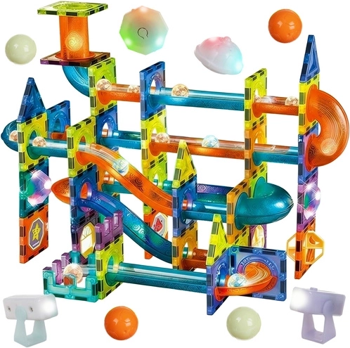 Magnētiskie klucīši ar bumbiņu trasi ļauj bērniem celt torņus, tiltus un spirālveida nobraucienus un vērot, kā bumbiņas traucas caur caurspīdīgiem tuneļiem. Stipri magnētiskie savienojumi nodrošina konstrukciju stabilitāti bez liekiem sabrukumiem, savukārt LED elementi pārvērš katru būvi gaismas šovā. Komplektā ir arī krāsaina soli pa solim instrukcija, kas atvieglo ātru sākumu un iedvesmo jauniem risinājumiem.