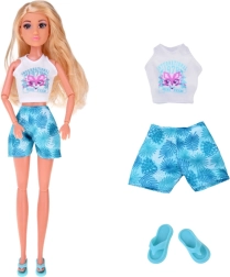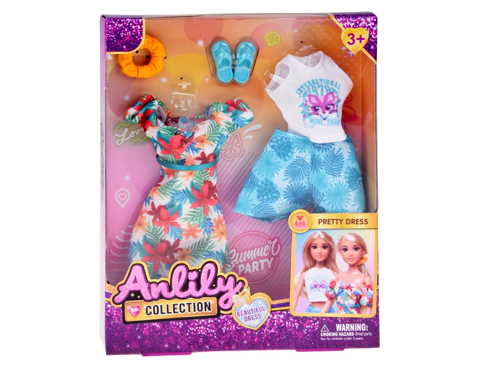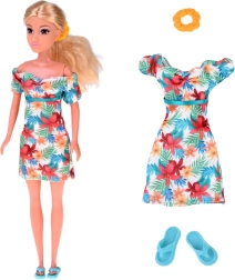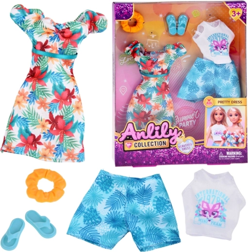 Komplektā ir divi vasaras stili: viegls kleitiņas modelis ar Havaju ziediem, ideāls pastaigām pludmalē, un balts kropkrekls ar šortiem ar lapu motīvu ērtām, ar piedzīvojumiem pilnām dienām. Lieliski piemērots radošai spēlei, pārģērbšanai un vasaras stāstu veidošanai.