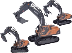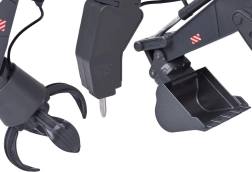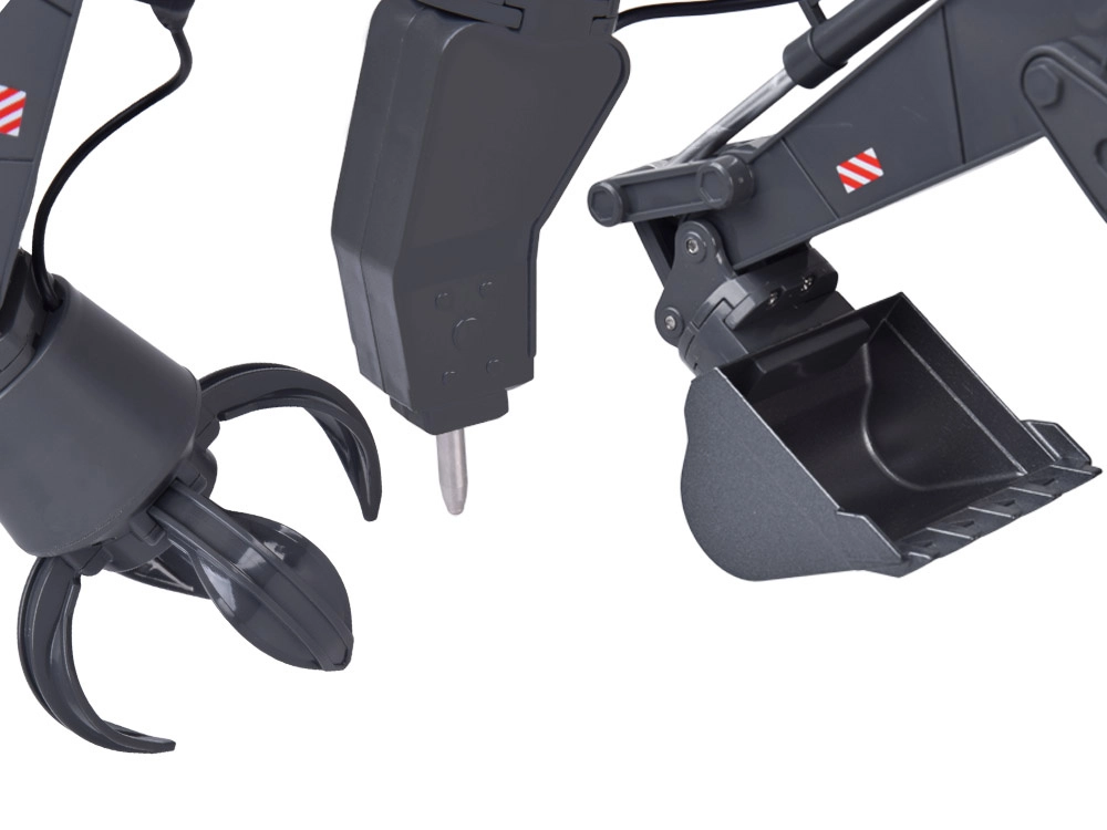 Komplektā ir trīs nomaināmi uzgaļi – kauss, satvērējs un demontāžas āmurs –, kas ļauj viegli pielāgot ekskavatoru dažādiem uzdevumiem. LED apgaismojumu un skaņas efektus var vienkārši ieslēgt vai izslēgt. Metāla kauss, plastmasas kabīne un izturīgs izpildījums sola ilgstošu izklaidi.