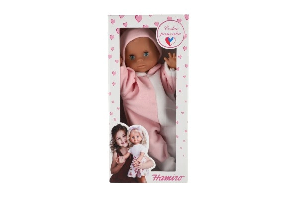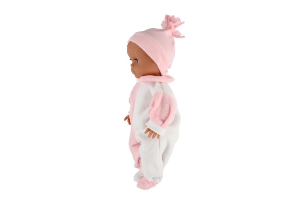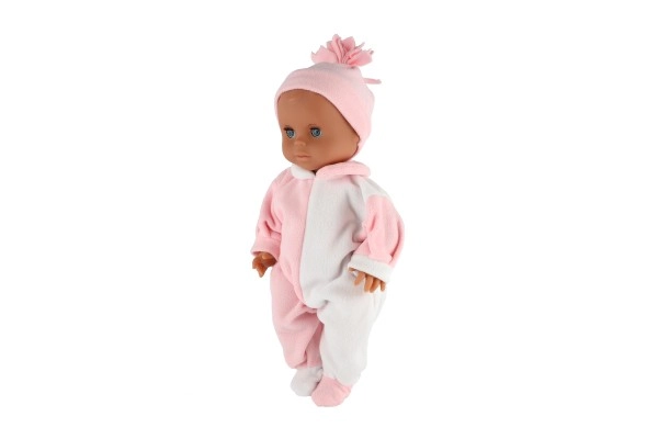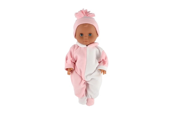 Stilīgs kombinezons baltā un rozā krāsā ar saskaņotu cepurīti piešķir lellei mīlīgu izskatu, kuru bērni iemīlēs.