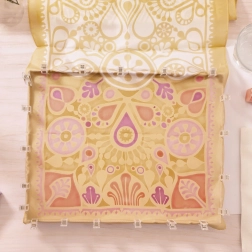 Gatavais lakats ir gaisīgs un patīkams pieskārienam, ar izteiksmīgu ziedu un ģeometrisku rakstu siltos toņos.