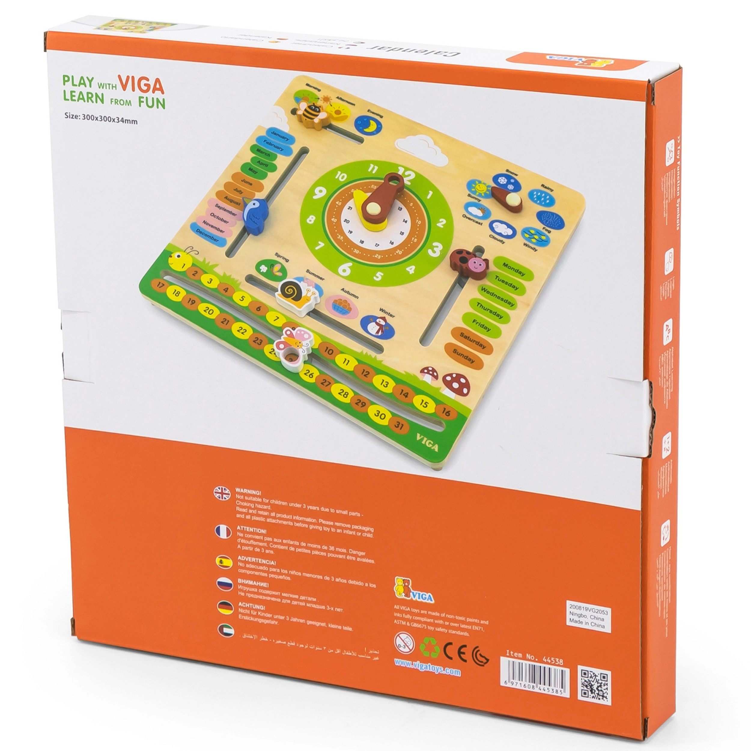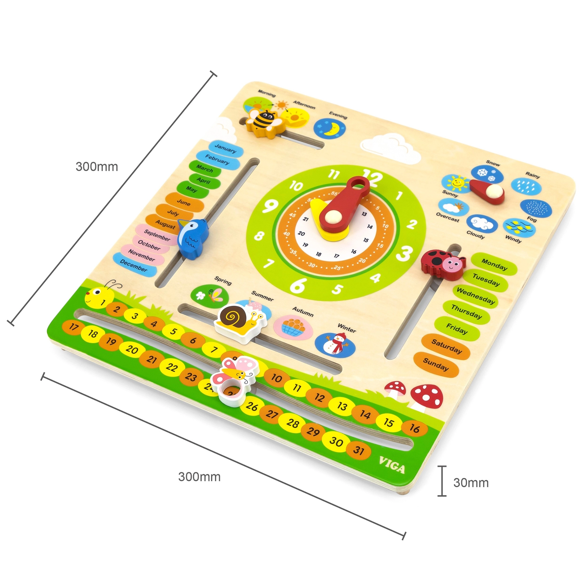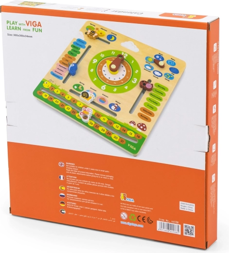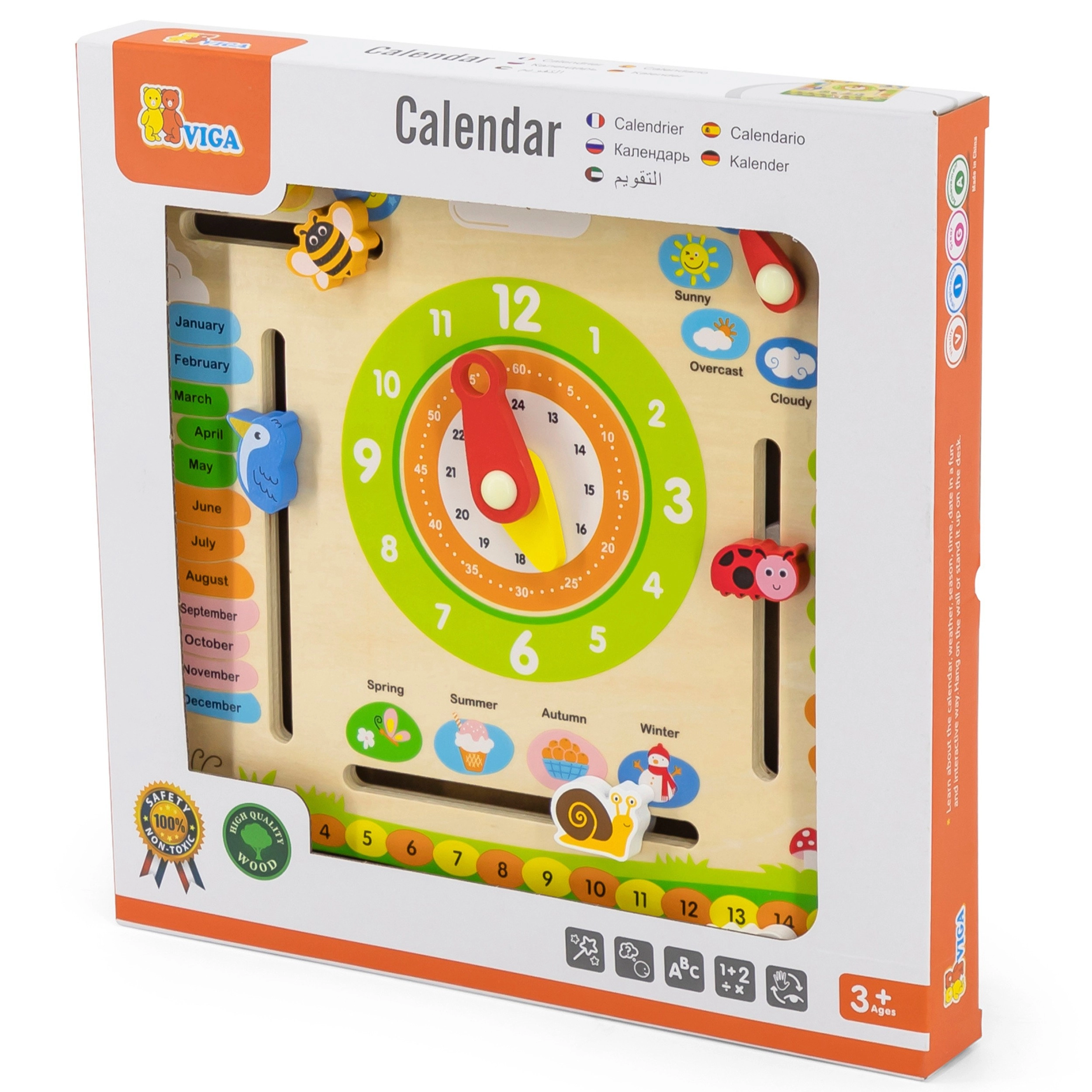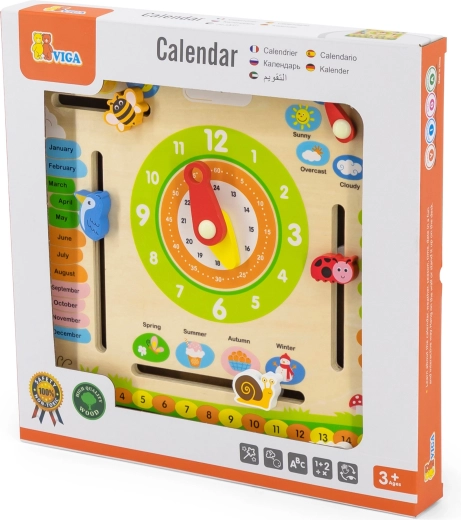 Atklājiet laiku, dienas, mēnešus un laikapstākļus ar Viga koka mācību kalendāru ar pulksteni. Šis kvalitatīvais, drošais un košais palīgs veicina angļu valodas apguvi, laika nolasīšanas treniņu no analoga pulksteņa un loģikas un sīkās motorikas attīstību. Lielisks palīglīdzeklis mājās, bērnudārzā un skolā, piemērots Montessori pieejai.
