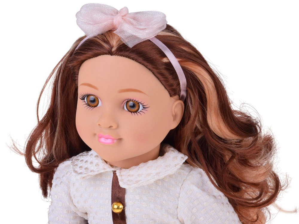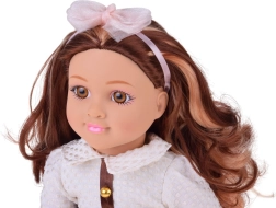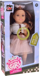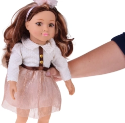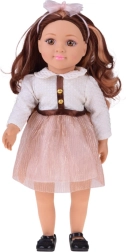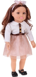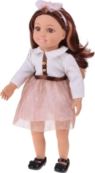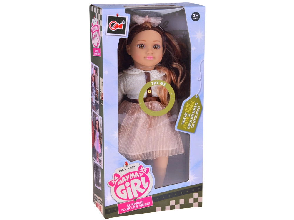 Apburošā lelle MAY MAY GIRL izceļas ar realistiskām detaļām un kvalitatīvu izpildījumu. Balts, strukturēts krekliņš ar zelta pogām, mirdzoši rozā svārki ar jostu un matu stīpiņa ar bantīti veido elegantu modes komplektu, kas rosina fantāziju un stilīgu pārģērbšanos.