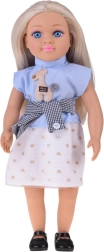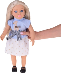 Lelle ir tērpta elegantā komplektā – zils tops ar svītrām un aplikāciju, šika josta un krēmkrāsas svārki ar zelta motīviem veido harmonisku tērpu, ko papildina melnas balerīnkurpes. Pateicoties kustīgām rokām, kājām un galvai, lelli var viegli apsēdināt un noaranžēt dažādās pozās skatiņu un stāstu izspēlēšanai.