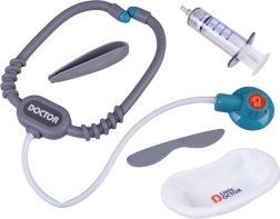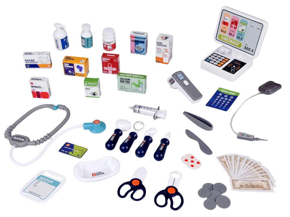 Komplektā ir kase ar termināli (apmaksa ar karti un “skaidru naudu”), stetoskops ar sirds pukstu skaņu, elektroniskais termometrs un virkne medicīnisku instrumentu un “zāļu” kastīšu. Komplekts attīsta komunikāciju, sīko motoriku un pamatfinanšu pratību.