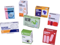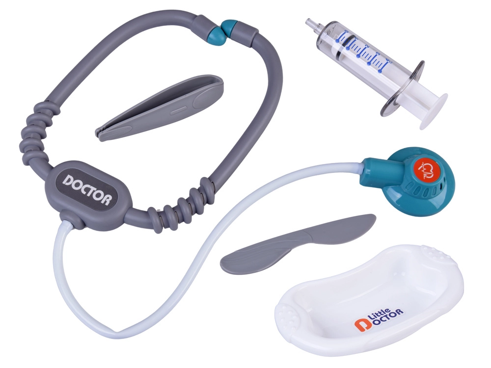 - Stetoskops ar skaņu, elektroniskais termometrs, šļirce, šķēres, pincetes, otoskops, āmuriņš, spogulītis, trauciņš, infūzija, “tablešu” blisteris, “zāļu” kastītes un pudelītes