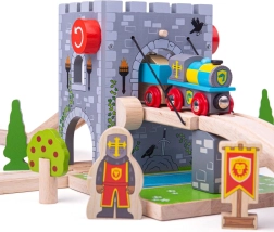 Izveidojiet uz trases viduslaiku cietoksni! BIGJIGS RAIL koka paceļamais tilts ar funkcionālu vinču ļauj bērniem pacelt tiltu, apturēt vilcieniņu un inscenēt bruņinieku piedzīvojumus. Reālistiskas akmens mūra faktūras, ģerboņi, lāpas un tilts pār “ūdens” grāvi rosina iztēli un tematisko spēli.