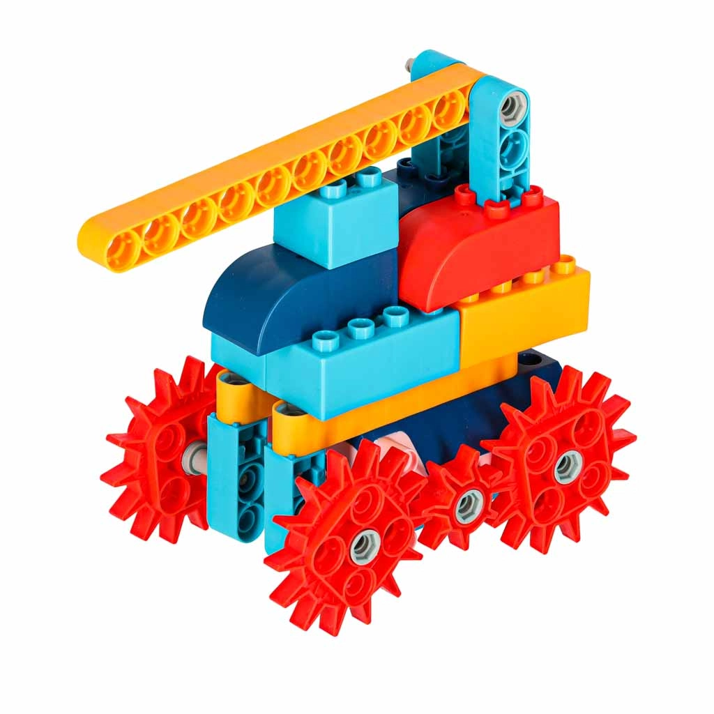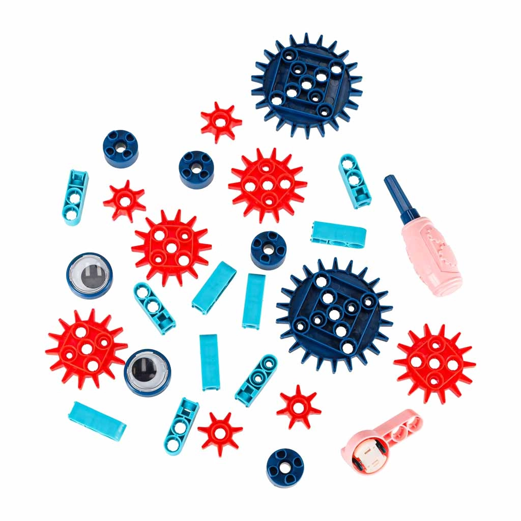 Dažāda izmēra zobrati, vārpstas un savienojumi ļauj veidot pārnesumus un rotāciju. Bērni praktiski apgūst mehānikas un kustības pārneses principus.