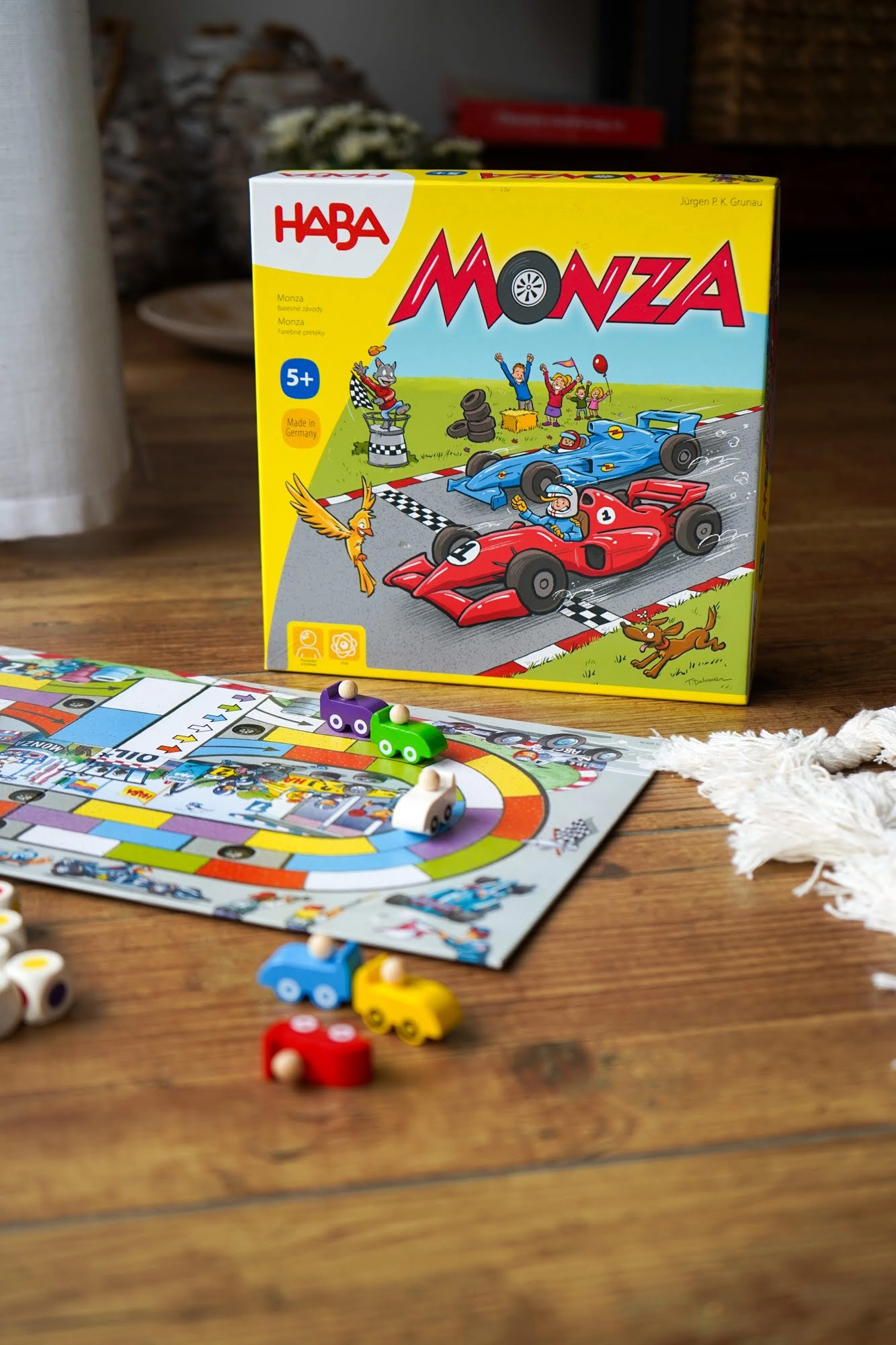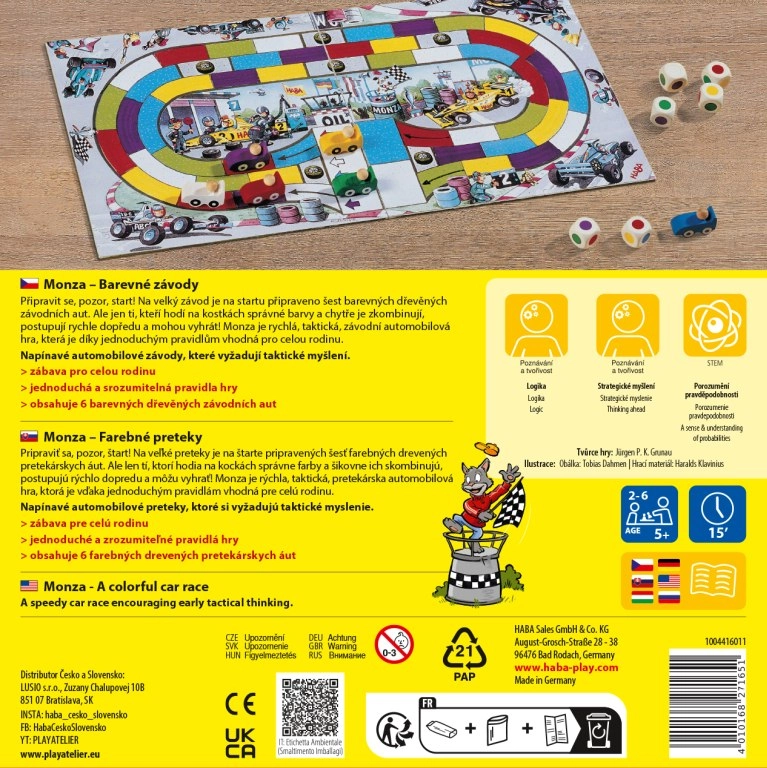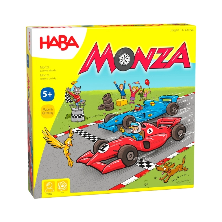 Izklaidējoša ģimenes spēle Monza no zīmola Haba piedāvā ātrus braucienus, kuros apvienojas taktika un veiksme. Pateicoties vienkāršiem noteikumiem, tā ir ideāla gan bērniem, gan pieaugušajiem, spēlē 2–6 spēlētāji, un viena partija ilgst tikai aptuveni 15 minūtes.