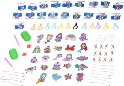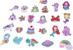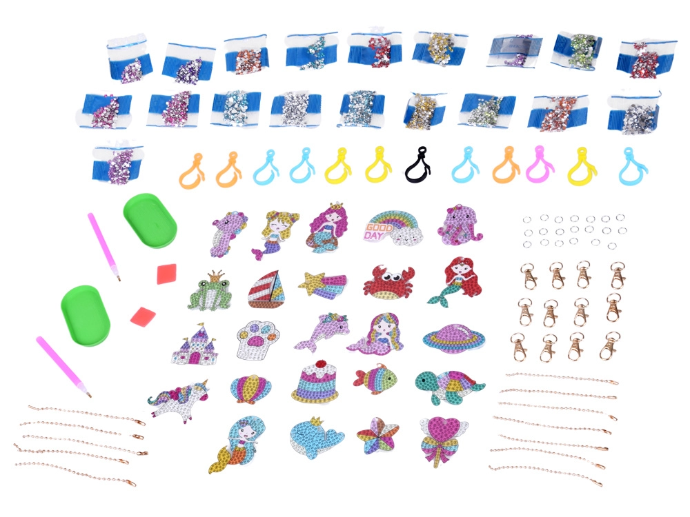 Komplektā atradīsiet motīvus, piemēram, jūras fejas, delfīnu, krabi, jūraszirdziņu, vali ar kroni, varavīksni, planētu, pili, vienradzi, torti, kaķa ķepu, čaulu un citus. Katram piekariņam ir iepriekš uzdrukāti lauciņi akmentiņiem, tāpēc bērni viegli sapratīs, kur katru akmentiņu novietot. Atliek tikai izbērt akmentiņus paliktnī, paņemt ar aplikatoru ar vasku un pielikt.
