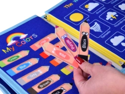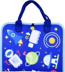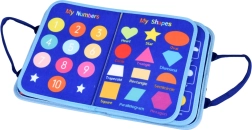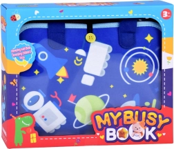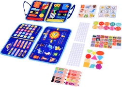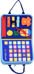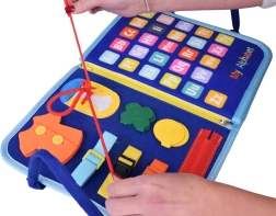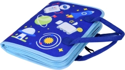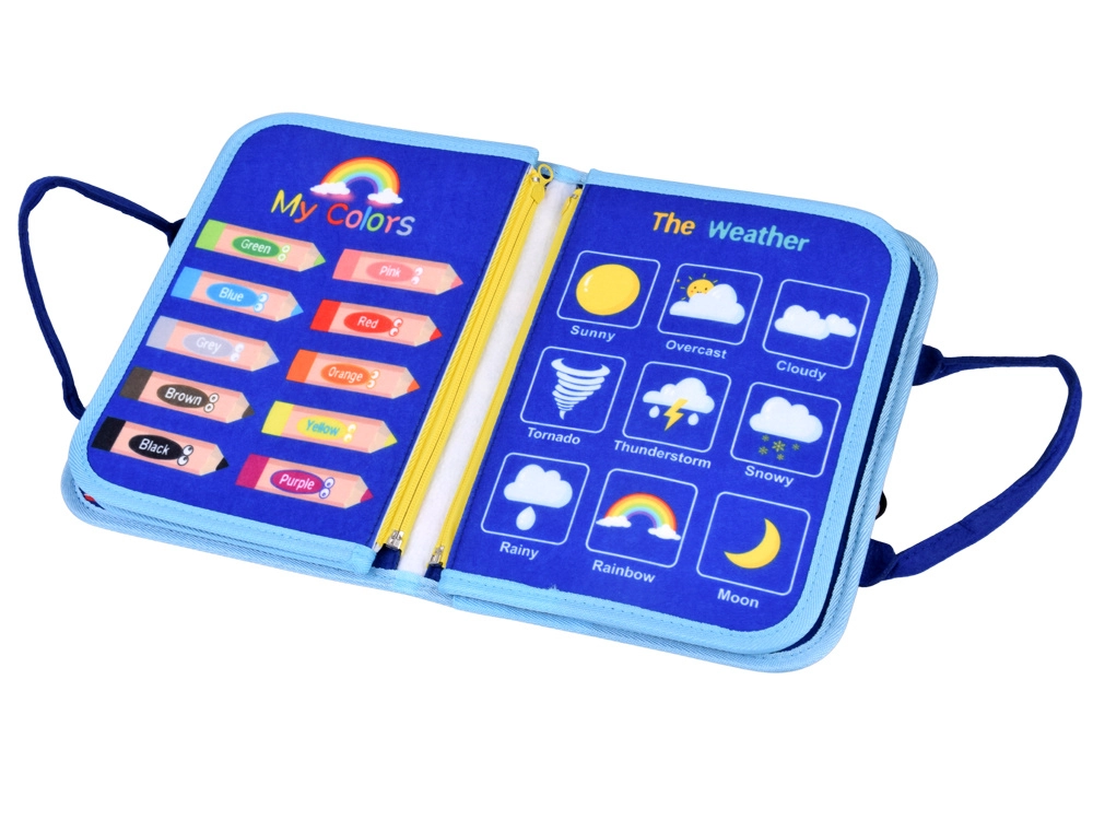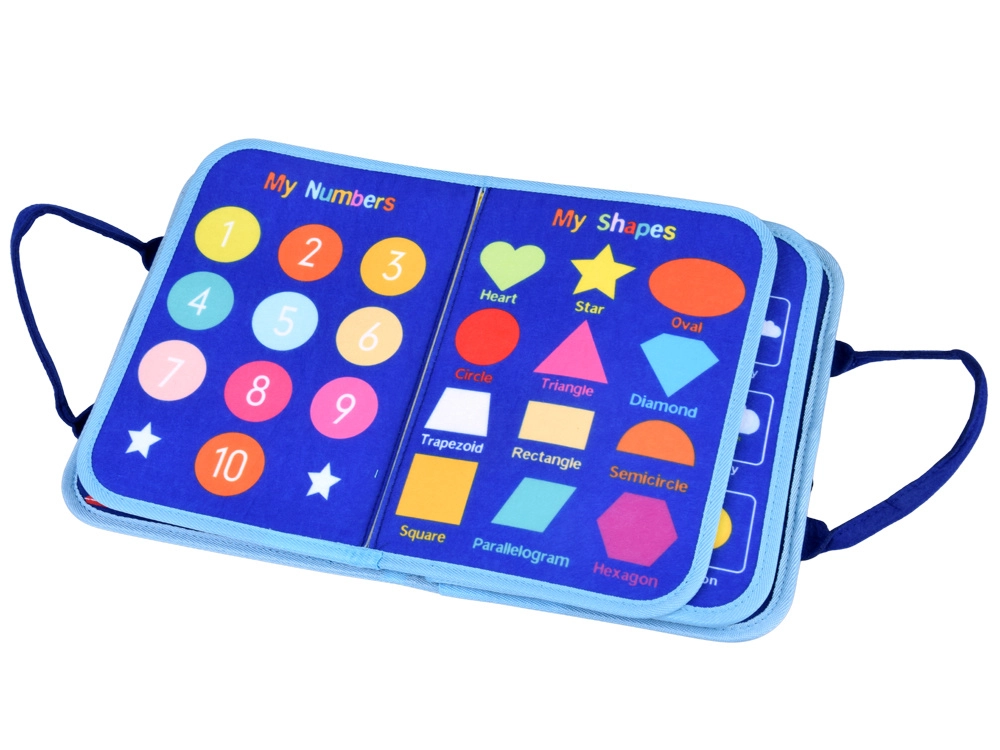 Pārnēsājama tekstila aktivitāšu grāmata bērniem ar 10 interaktīvām lapām attīsta sīko motoriku, loģisko domāšanu un radošumu. Iekļauj aktivitātes kā alfabēts, skaitļi 1–10, formas, krāsas, laikapstākļi, dzīvnieki, kalendārs un pulkstenis, kā arī sausdzēšamā tāfele ar flomāsteriem. Mīksti materiāli, rāvējslēdzējs un rokturi nodrošina drošu un vieglu lietošanu mājās un ceļā.