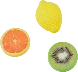 Krāsaini plastmasas augļi – citrons, kivī un apelsīns – rosina fantāziju un dažādus kulinārus scenārijus.