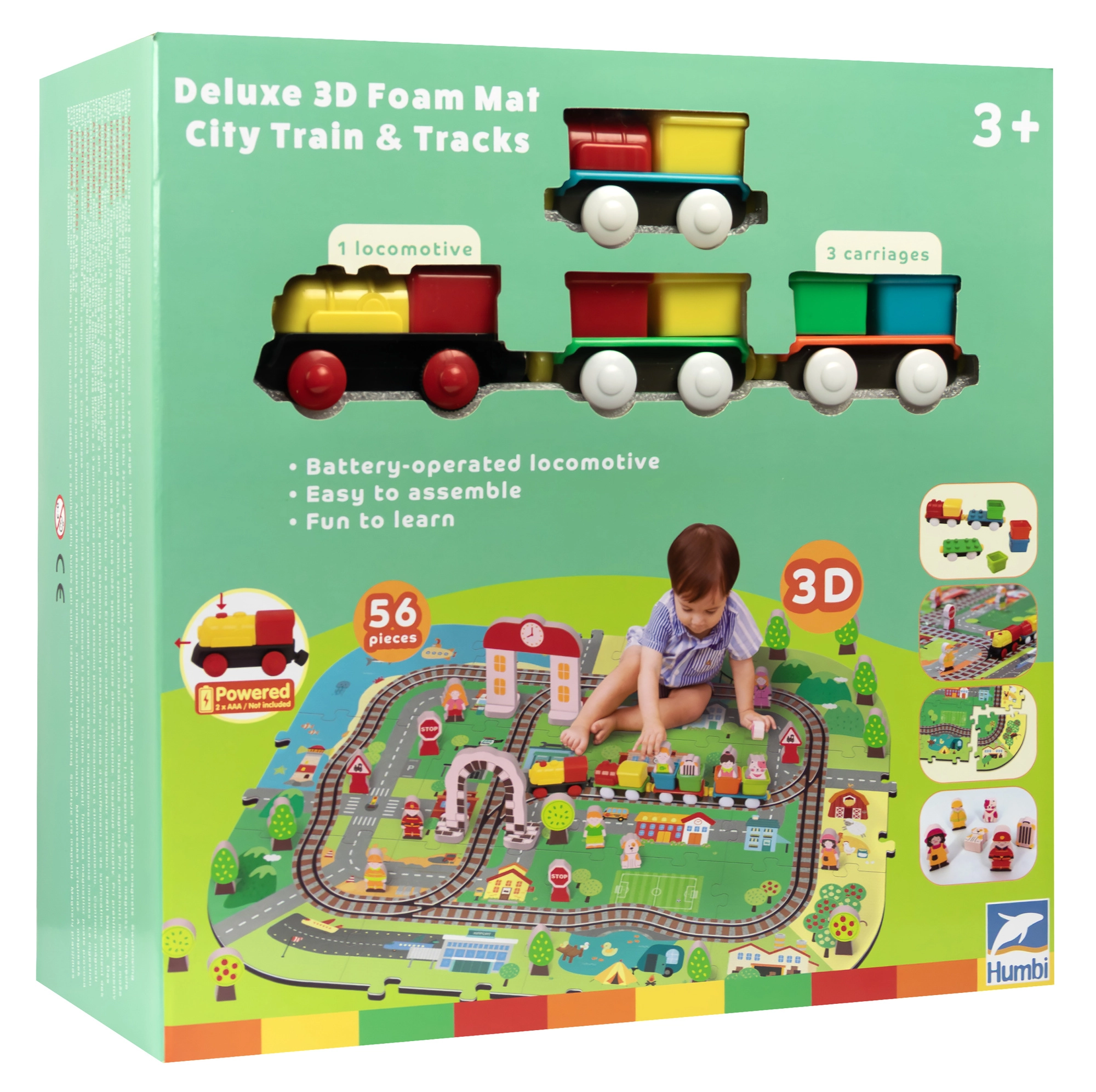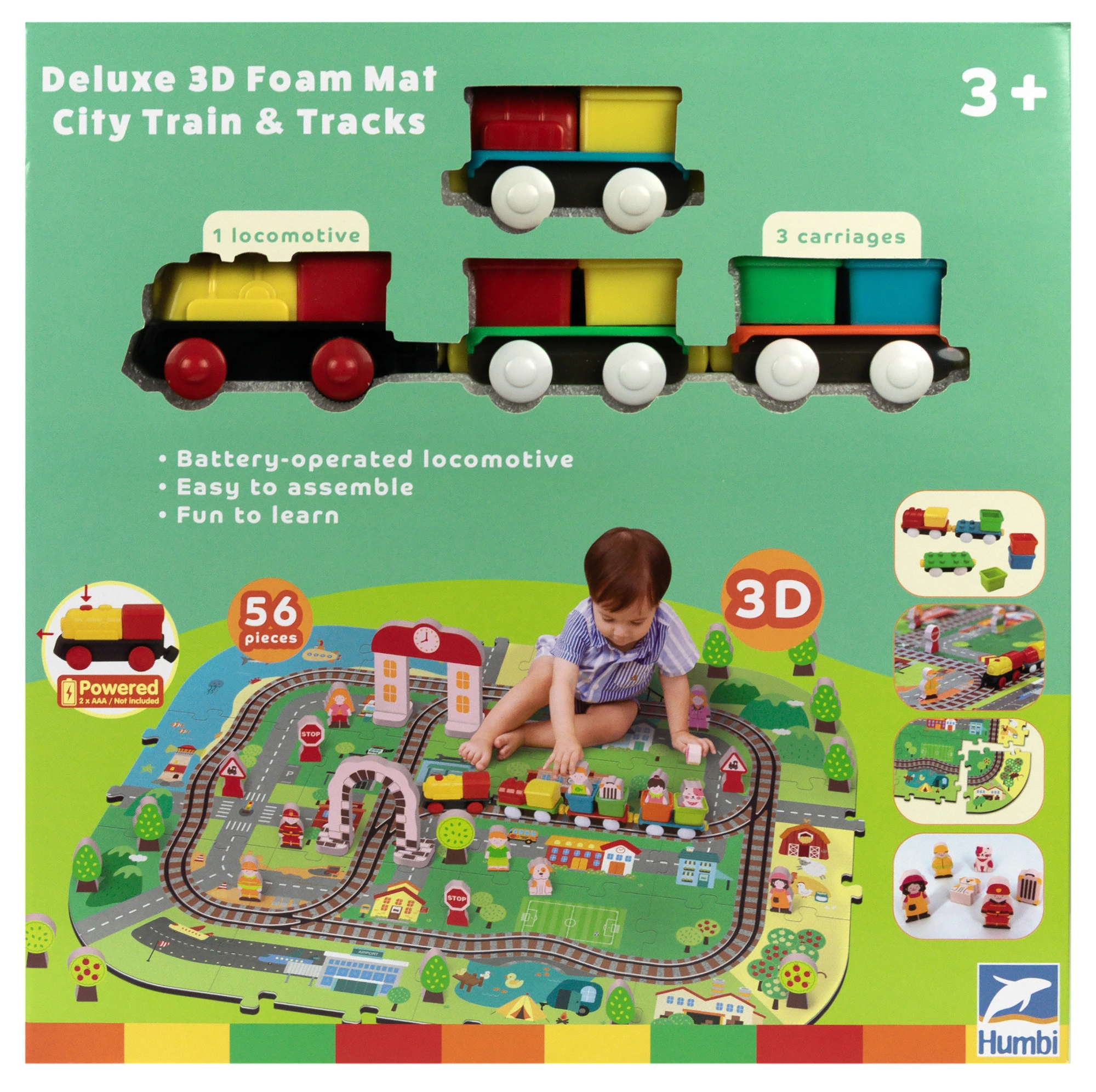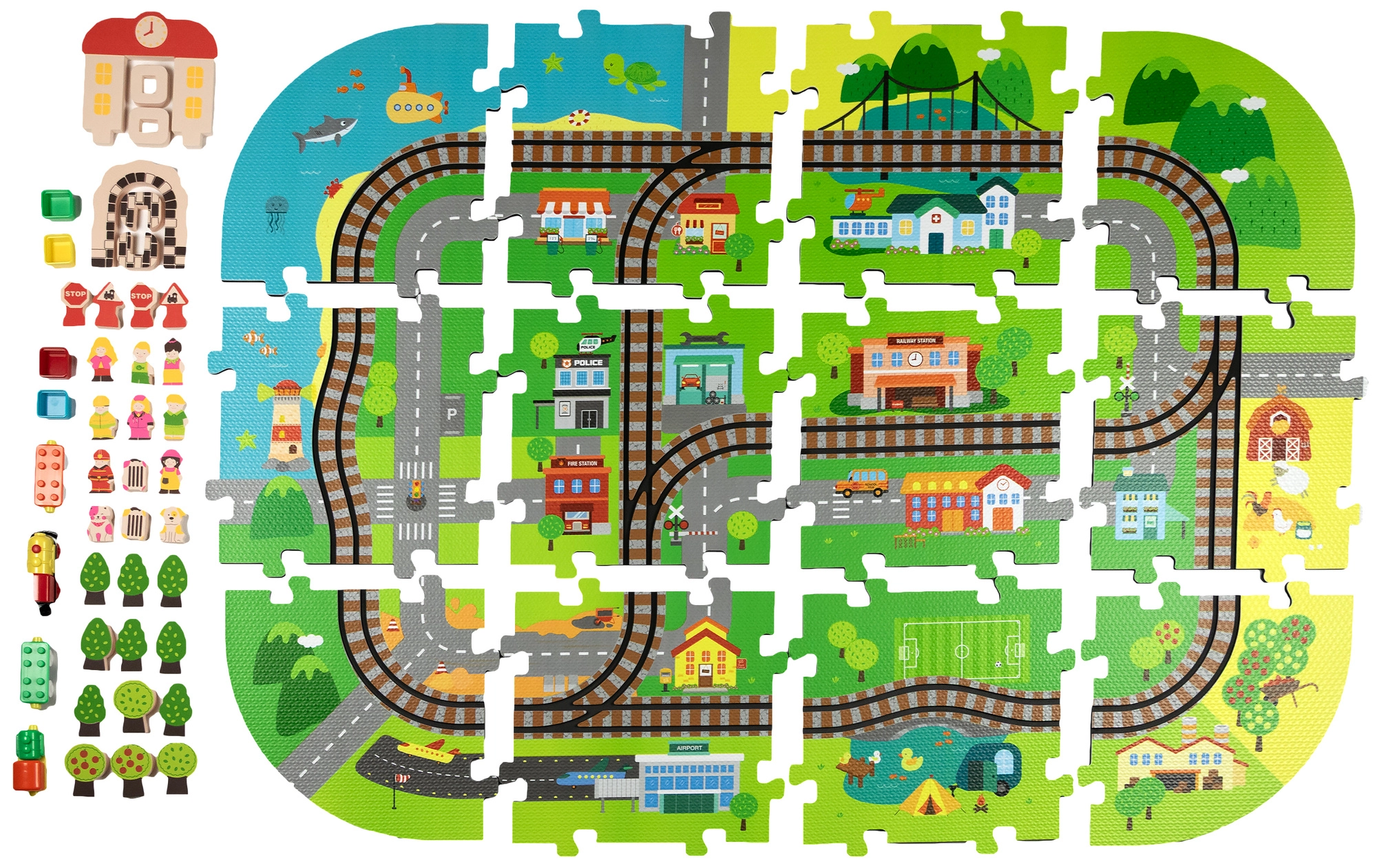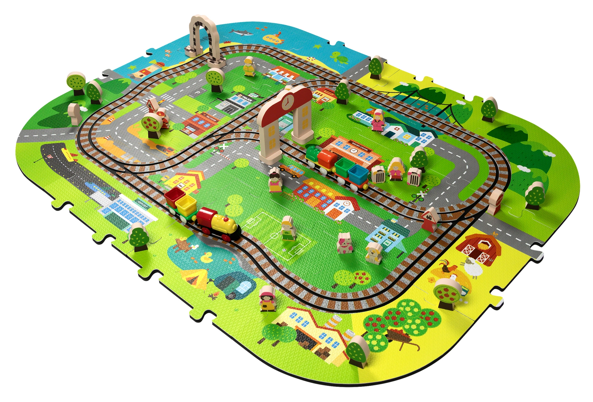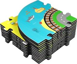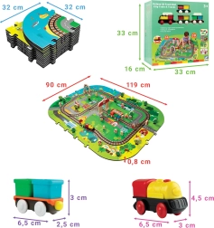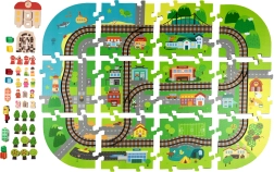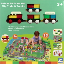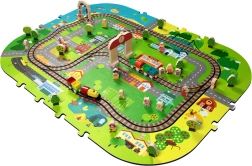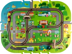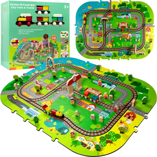 Šis radošais komplekts apvieno mīkstu grīdas paklājiņu ar 3D pilsētu un sliežu trasi. Bērni izveidos košu ainu ar ieliņām, ēkām, lidostu, saimniecību, jūru, kempingu un kalniem un ļaus ar baterijām darbināmai lokomotīvei vienmērīgi braukt pa salikto trasi. Biezās EVA putu detaļas absorbē triecienus, izolē no aukstuma un rada drošu spēļu vidi.