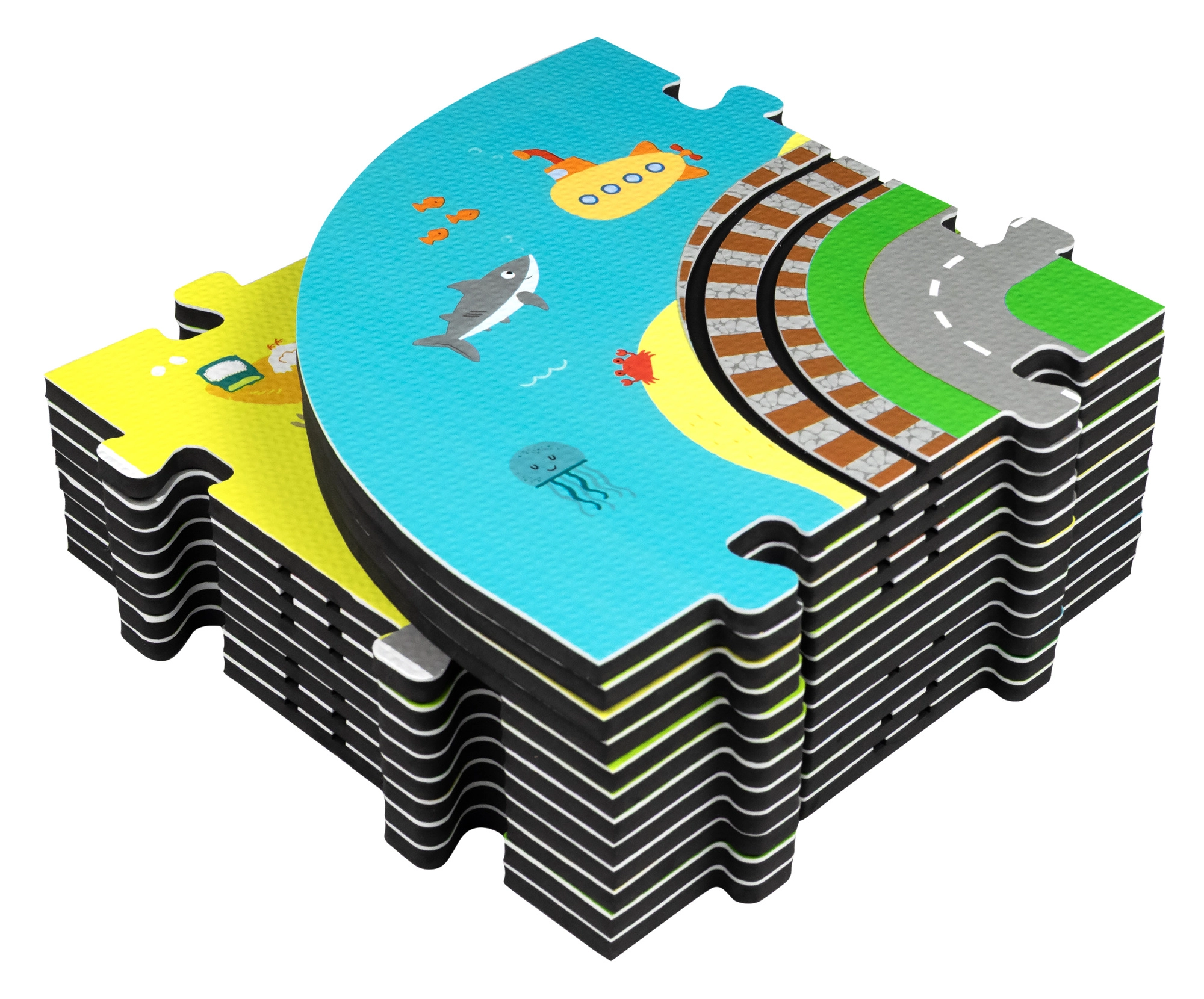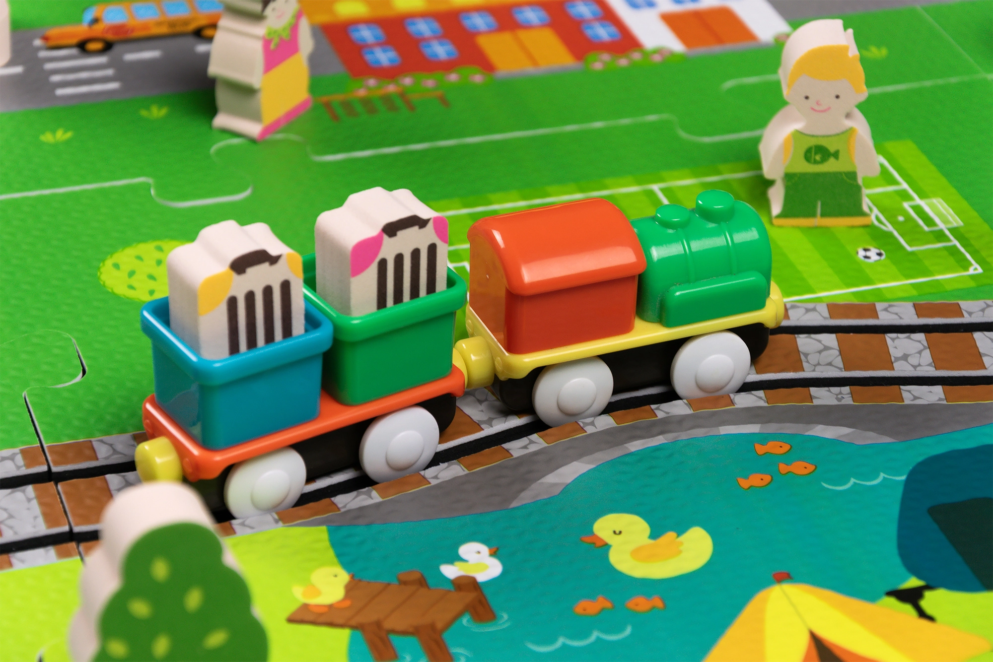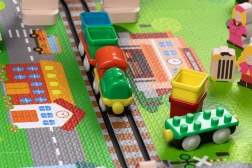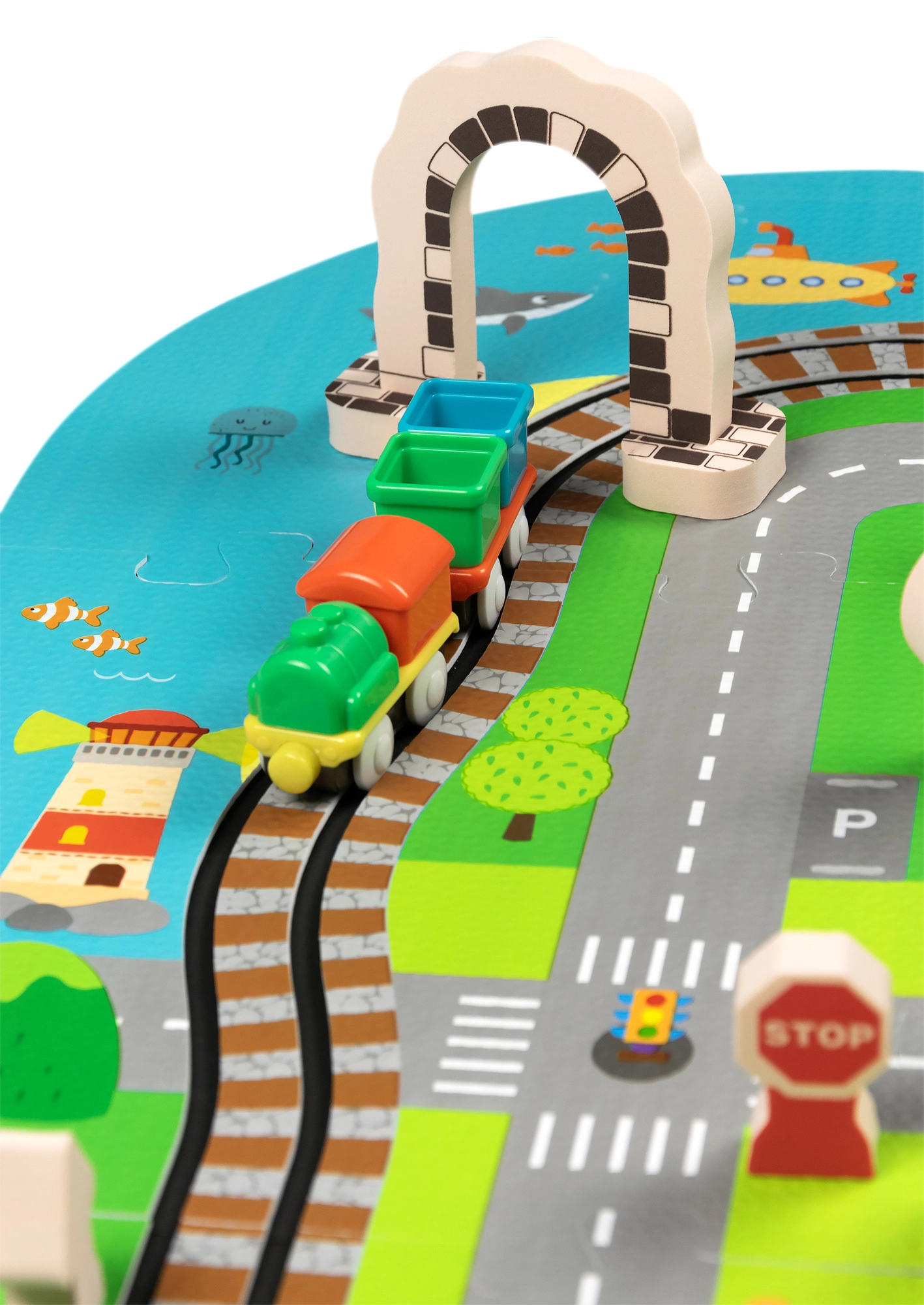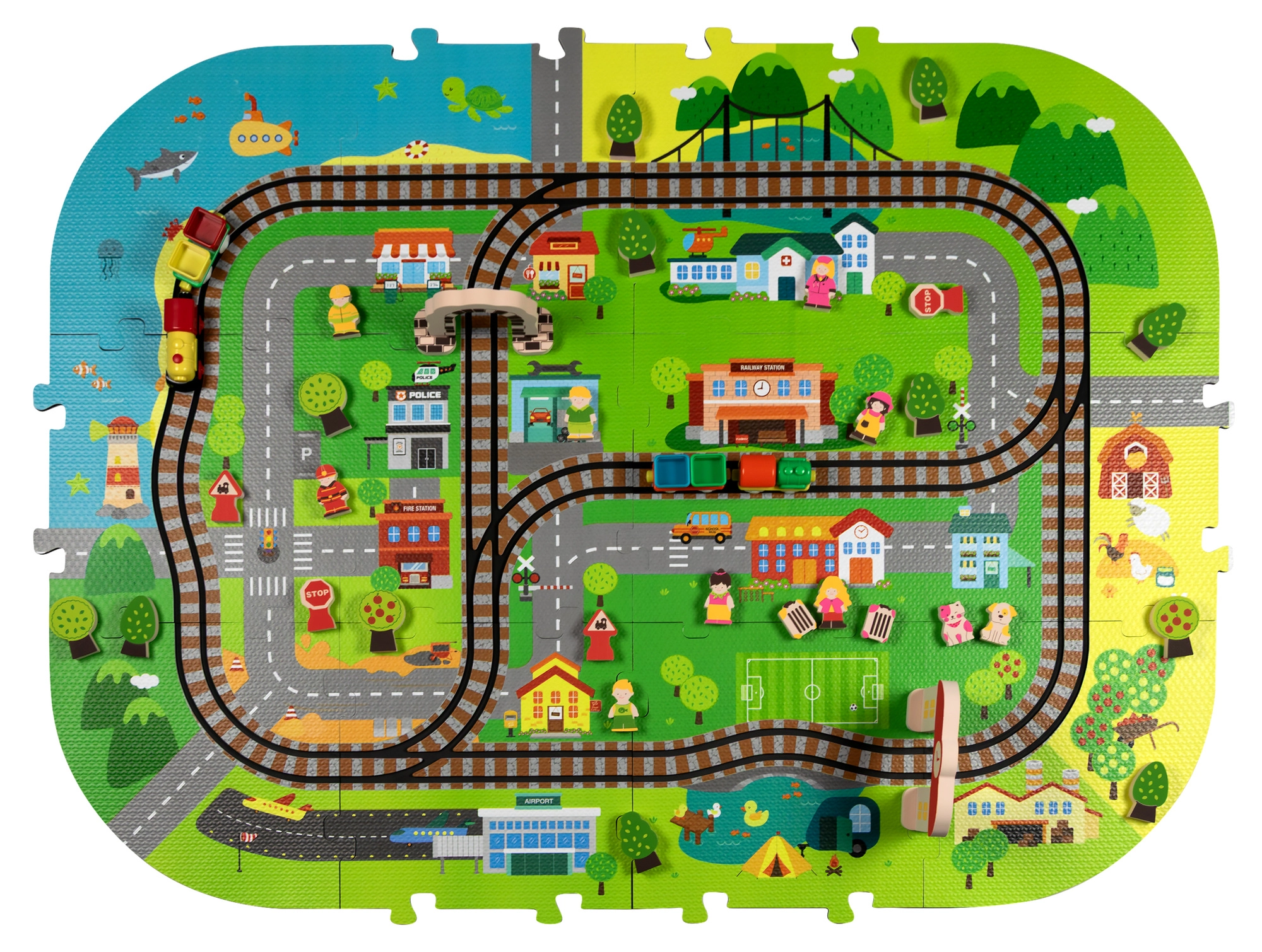 Šis radošais komplekts apvieno mīkstu grīdas paklājiņu ar 3D pilsētu un sliežu trasi. Bērni izveidos košu ainu ar ieliņām, ēkām, lidostu, saimniecību, jūru, kempingu un kalniem un ļaus ar baterijām darbināmai lokomotīvei vienmērīgi braukt pa salikto trasi. Biezās EVA putu detaļas absorbē triecienus, izolē no aukstuma un rada drošu spēļu vidi.