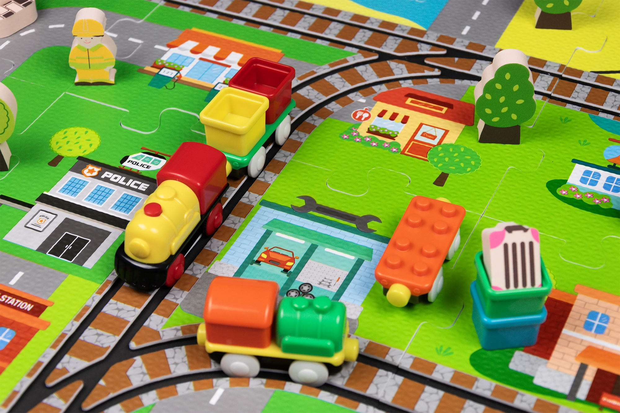Savienojiet detaļas kā puzli un izveidojiet savu pilsētu ar ielām, sliedēm, ēkām un dabu. Izturīgās EVA detaļas saglabā formu un ir viegli tīrāmas.